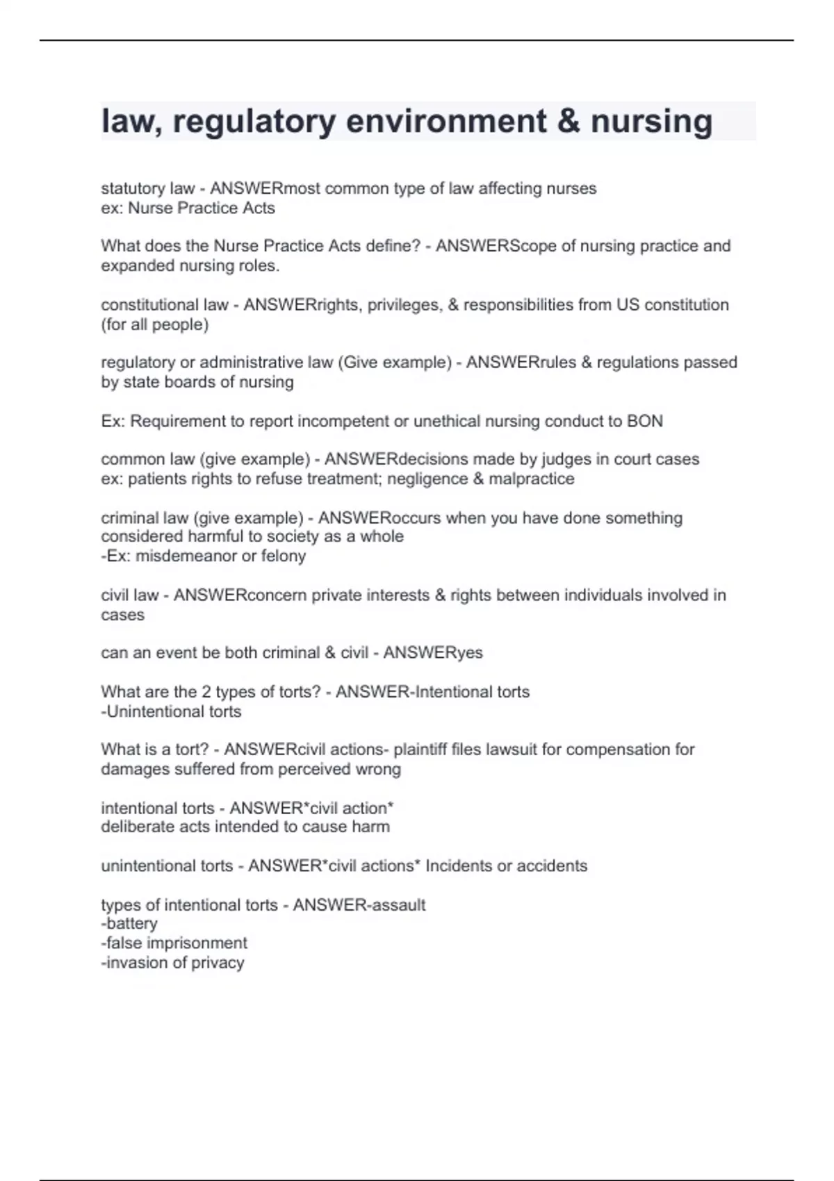 law, regulatory environment & nursing.Full practice test graded 100%