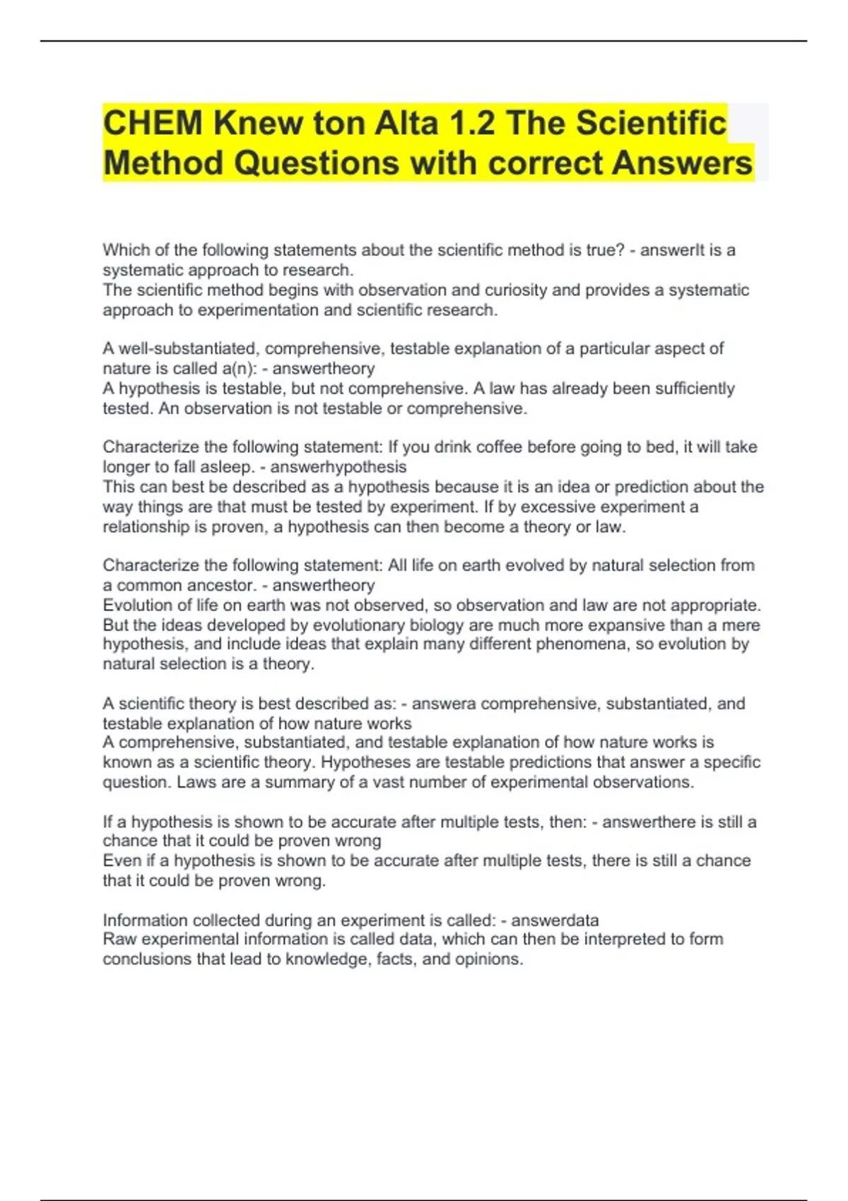 CHEM Knew ton Alta 1.2 The Scientific Method Questions with correct Answers Which of the following statements about the scientific method is true? It is a systematic approach to research. The scientific method begins with observation and curiosity and provides a systematic approach to experimentation and scientific research. A well-substantiated, comprehensive, testable explanation of a particular aspect of nature is called a(n): theory A hypothesis is testable, but not comprehensive. A law has already been sufficiently tested. An observation is not testable or comprehensive. Characterize the following statement: If you drink coffee before going to bed, it will take longer to fall asleep. hypothesis This can best be described as a hypothesis because it is an idea or prediction about the way things are that must be tested by experiment. If by excessive experiment a relationship is proven, a hypothesis can then become a theory or law. Characterize the following statement: All life on earth evolved by natural selection from a common ancestor. theory Evolution of life on earth was not observed, so observation and law are not appropriate. But the ideas developed by evolutionary biology are much more expansive than a mere hypothesis, and include ideas that explain many different phenomena, so evolution by natural selection is a theory. A scientific theory is best described as: a comprehensive, substantiated, and testable explanation of how nature works A comprehensive, substantiated, and testable explanation of how nature works is known as a scientific theory. Hypotheses are testable predictions that answer a specific question. Laws are a summary of a vast number of experimental observations. If a hypothesis is shown to be accurate after multiple tests, then: there is still a chance that it could be proven wrong Even if a hypothesis is shown to be accurate after multiple tests, there is still a chance that it could be proven wrong. Information collected during an experiment is called: data Raw experimental information is called data, which can then be interpreted to form conclusions that lead to knowledge, facts, and opinions. Which of the following is true? A law is formed when testing yields constant observations. In order to be valid, a hypothesis must be: testable In order to be valid, a hypothesis must be testable. A tentative explanation of observations that acts as a guide for gathering and checking information is called a: hypothesis The hypothesis initiates further experimenting, which could lead to a theory or a law. The entirety of this process is called the scientific method. A pattern that has been established based on verified experimental data that describes an observation but does not provide an explanation as to the reason why said observation occurs is a _________. law A law is a pattern that has been established based on verified experimental data. Laws provide a description of a particular observation, but does not go so far as to explain why the observation occurs. For example, the law of conservation of energy states that energy is neither created nor destroyed but does not explain why this is the case. Place the following steps of the scientific method in the correct order. 1.Hypothesis becomes theory. 2.Curiosity leads to observations. 3.Experiment is performed and results are consistent with prediction. 4.Hypothesis is created. 5.Additional testing is conducted and it supports hypothesis. 2, 4, 3, 5, 1 The diagram above shows that all scientific investigations start with a simple curiosity based on observations. After that initial step, scientists create a hypothesis and conduct an experiment to test their hypothesis. If much additional testing is done that supports the hypothesis, then it becomes a theory. Which of the following is an example of a hypothesis? Providing plants fertilizer will help them grow taller. A proposed and testable explanation for an observation is known as a hypothesis The point at which water freezes is a scientific fact, all matter is composed of atoms is a theory which as been tested over and over, and force is equal to mass multiplied acceleration is an example of a law. Which of the following statements is true? Theories attempt to explain observations. What is conducted in order to test the validity of a hypothesis? an experiment An experiment is conducted in order to test the validity of a hypothesis. Select the statement that best completes the following sentence: __________________ sets science apart from other methods of discovery. The process of experimentation Knowledge can be taught to many kinds of people and documented in many ways, but it is the process of recording and interpreting experimental data that sets science apart from other areas of inquiry.