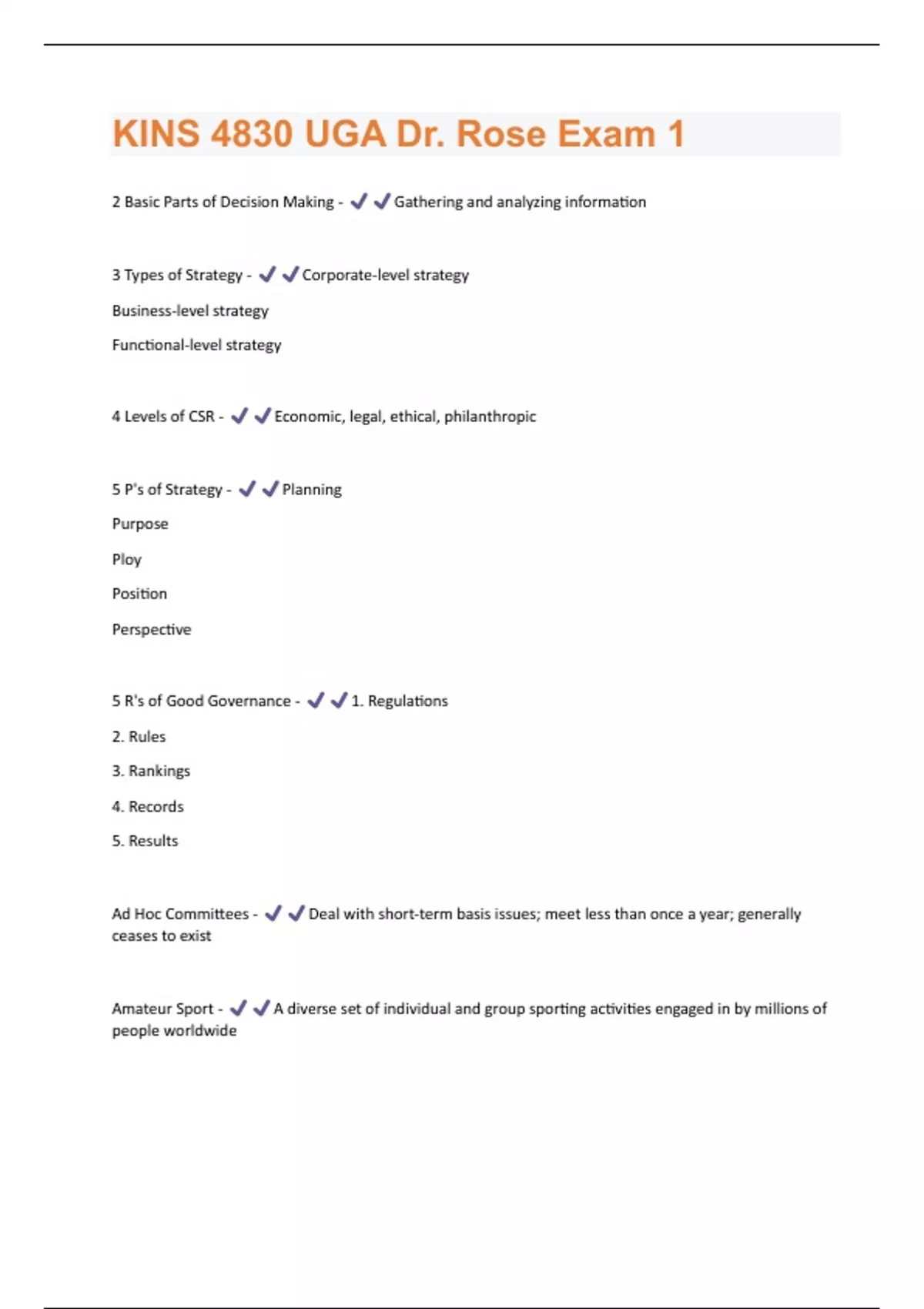 2 Basic Parts of Decision Making - Gathering and analyzing information 3 Types of Strategy - Corporate-level strategy Business-level strategy Functional-level strategy 4 Levels of CSR - Economic, legal, ethical, philanthropic 5 P's of Strategy - Planning Purpose Ploy Position Perspective 5 R's of Good Governance - 1. Regulations 2. Rules 3. Rankings 4. Records 5. Results Ad Hoc Committees - Deal with short-term basis issues; meet less than once a year; generally ceases to exist Amateur Sport - A diverse set of individual and group sporting activities engaged in by millions of people worldwideApplying CSR to Sport - Helps companies stay ahead of public scrutiny and align the brand with social issues and their mission statement; charitable activities, sustainability, collaboration, diversity and inclusion, etc. Attributes of an Organization - Identity, program of activity, membership, clear boundaries, permanency, division of labor, hierarchy of authority, formal rules and procedures Case Method Analysis Steps for Developing Policy - 1. Define the problem. 2. Collect information and formulate options. 3. Evaluate the options. 4. Choose the favored option and define the action. (written policy statement) Clear Boundaries - Published, league-approved rosters; can be easily verified Codes of Ethics - Dignity, integrity, resources, candidatures, relations with states, confidentiality, implementation Complex Decisions - (Nonprogrammed decisions) nonroutine and novel Corporate Social Responsibility (CSR) - A business's concern for society's welfare Current policy issues relative to funding, competition for limited facilities, activity trends, access, event management, risk management, medical issues, and access for people with disabilities - Fundingfacilities and proper funds for whichever activities are to be funded Competition for limited facilities- timing and policies need to be worked out for who gets to use what when Activity trends- figuring out what activities to offer and whether to give into trends or not and figure out what's popular Access- figure out who is eligible to participate and where to cap it Event management- policies put in place to figure out how to run events related to sport and how to delegate funding and activitiesRisk management- be as prepared as possible; signage, protective gear requirements, waivers, etc. Medical issues- pre-activity screening to assess medical issues and determine safe eligibility Access opportunities for individuals with disabilities- policies for maximizing access for disabled individuals while ensuring safety and fair activities