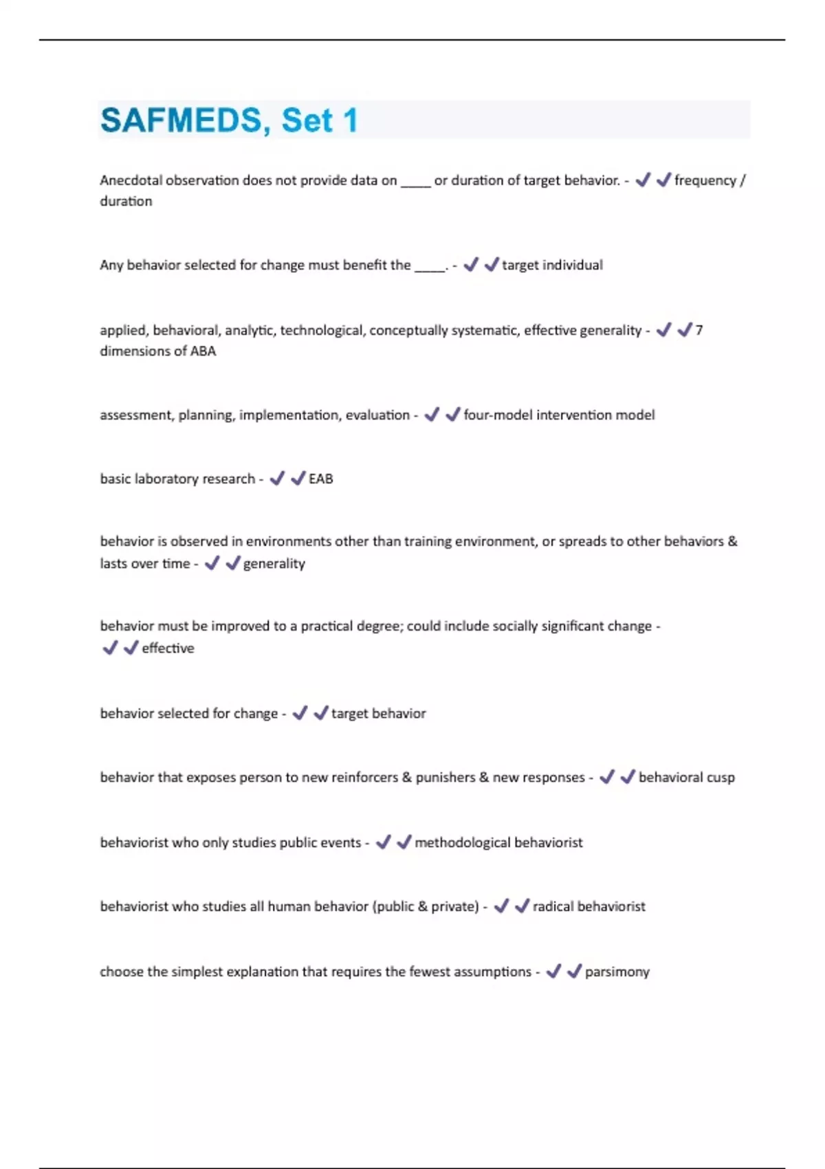 SAFMEDS, Set 1 Anecdotal observation does not provide data on ____ or duration of target behavior. - frequency / duration Any behavior selected for change must benefit the ____. - target individual applied, behavioral, analytic, technological, conceptually systematic, effective generality - 7 dimensions of ABA assessment, planning, implementation, evaluation - four-model intervention model basic laboratory research - EAB behavior is observed in environments other than training environment, or spreads to other behaviors & lasts over time - generality behavior must be improved to a practical degree; could include socially significant change - effective behavior selected for change - target behavior behavior that exposes person to new reinforcers & punishers & new responses - behavioral cusp behaviorist who only studies public events - methodological behaviorist behaviorist who studies all human behavior (public & private) - radical behaviorist choose the simplest explanation that requires the fewest assumptions - parsimony