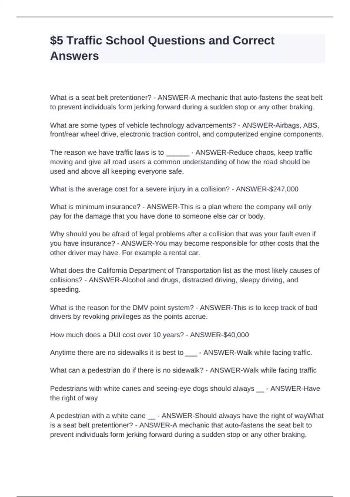 What is a seat belt pretentioner? - ANSWER-A mechanic that auto-fastens the seat belt to prevent individuals form jerking forward during a sudden stop or any other braking. What are some types of vehicle technology advancements? - ANSWER-Airbags, ABS, front/rear wheel drive, electronic traction control, and computerized engine components. The reason we have traffic laws is to ______ - ANSWER-Reduce chaos, keep traffic moving and give all road users a common understanding of how the road should be used and above all keeping everyone safe. What is the average cost for a severe injury in a collision? - ANSWER-$247,000 What is minimum insurance? - ANSWER-This is a plan where the company will only pay for the damage that you have done to someone else car or body. Why should you be afraid of legal problems after a collision that was your fault even if you have insurance? - ANSWER-You may become responsible for other costs that the other driver may have. For example a rental car. What does the California Department of Transportation list as the most likely causes of collisions? - ANSWER-Alcohol and drugs, distracted driving, sleepy driving, and speeding. What is the reason for the DMV point system? - ANSWER-This is to keep track of bad drivers by revoking privileges as the points accrue. How much does a DUI cost over 10 years? - ANSWER-$40,000 Anytime there are no sidewalks it is best to ___ - ANSWER-Walk while facing traffic. What can a pedestrian do if there is no sidewalk? - ANSWER-Walk while facing traffic Pedestrians with white canes and seeing-eye dogs should always __ - ANSWER-Have the right of way A pedestrian with a white cane __ - ANSWER-Should always have the right of wayWhat is a seat belt pretentioner? - ANSWER-A mechanic that auto-fastens the seat belt to prevent individuals form jerking forward during a sudden stop or any other braking. What are some types of vehicle technology advancements? - ANSWER-Airbags, ABS, front/rear wheel drive, electronic traction control, and computerized engine components. The reason we have traffic laws is to ______ - ANSWER-Reduce chaos, keep traffic moving and give all road users a common understanding of how the road should be used and above all keeping everyone safe. What is the average cost for a severe injury in a collision? - ANSWER-$247,000 What is minimum insurance? - ANSWER-This is a plan where the company will only pay for the damage that you have done to someone else car or body. Why should you be afraid of legal problems after a collision that was your fault even if you have insurance? - ANSWER-You may become responsible for other costs that the other driver may have. For example a rental car. What does the California Department of Transportation list as the most likely causes of collisions? - ANSWER-Alcohol and drugs, distracted driving, sleepy driving, and speeding. What is the reason for the DMV point system? - ANSWER-This is to keep track of bad drivers by revoking privileges as the points accrue. How much does a DUI cost over 10 years? - ANSWER-$40,000 Anytime there are no sidewalks it is best to ___ - ANSWER-Walk while facing traffic. What can a pedestrian do if there is no sidewalk? - ANSWER-Walk while facing traffic Pedestrians with white canes and seeing-eye dogs should always __ - ANSWER-Have the right of way