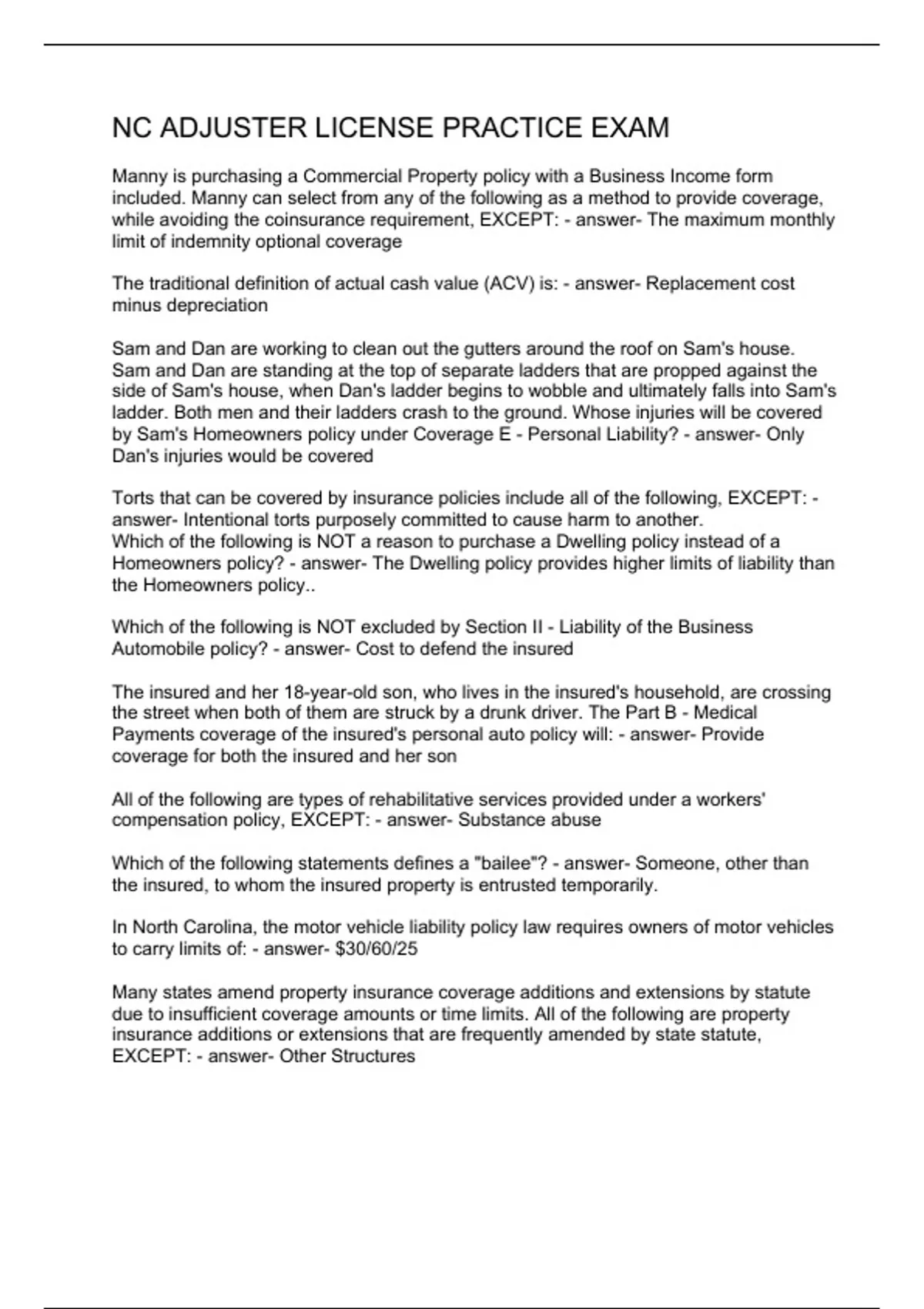 NC ADJUSTER LICENSE PRACTICE EXAM