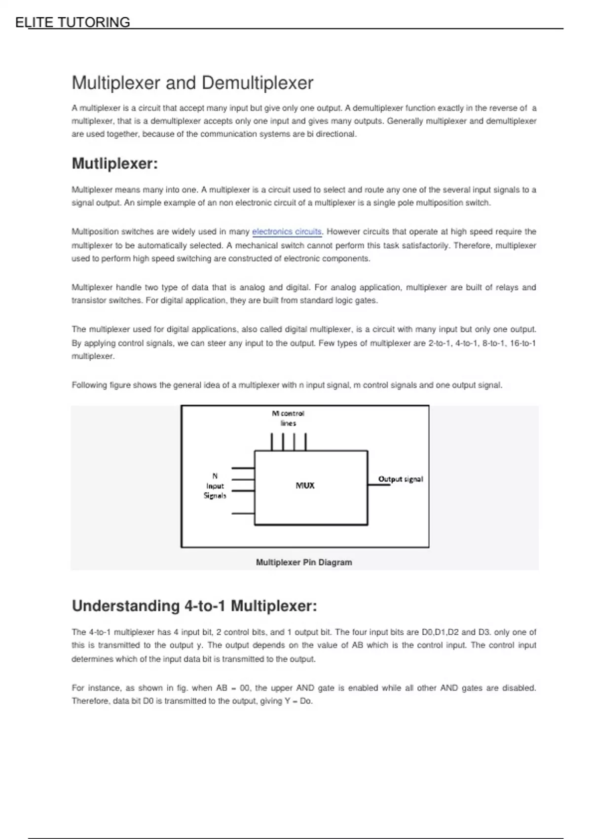 The document details multiplexers and demultiplexers, explaining their functions in digital circuits. It covers their design, operation, and applications in data routing and selection. Practical examples illustrate usage, emphasizing the importance of these components in efficient data management and communication systems.