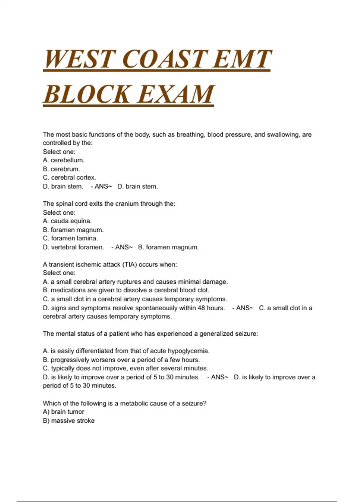 The most basic functions of the body, such as breathing, blood pressure, and swallowing, are controlled by the: Select one: A. cerebellum. B. cerebrum. C. cerebral cortex. D. brain stem. - ANS~ D. brain stem. The spinal cord exits the cranium through the: Select one: A. cauda equina. B. foramen magnum. C. foramen lamina. D. vertebral foramen. - ANS~ B. foramen magnum. A transient ischemic attack (TIA) occurs when: Select one: A. a small cerebral artery ruptures and causes minimal damage. B. medications are given to dissolve a cerebral blood clot. C. a small clot in a cerebral artery causes temporary symptoms. D. signs and symptoms resolve spontaneously within 48 hours. - ANS~ C. a small clot in a cerebral artery causes temporary symptoms. The mental status of a patient who has experienced a generalized seizure: A. is easily differentiated from that of acute hypoglycemia. B. progressively worsens over a period of a few hours. C. typically does not improve, even after several minutes. D. is likely to improve over a period of 5 to 30 minutes. - ANS~ D. is likely to improve over a period of 5 to 30 minutes. Which of the following is a metabolic cause of a seizure? A) brain tumor B) massive stroke C) poisoning D) head trauma - ANS~ C) poisoning Febrile seizures in a child: A. typically last less than 30 minutes. B. occur after a week of a febrile illness. C. are usually caused by viral meningitis. D. may indicate a serious underlying illness. - ANS~ D. may indicate a serious underlying illness. You arrive at a local grocery store approximately 5 minutes after a 21-year-old female stopped seizing. She is confused and disoriented; she keeps asking you what happened and tells you that she is thirsty. Her brother, who witnessed the seizure, tells you that she takes valproate (Depakote) for her seizures, but has not taken it in a few days. He also tells you that she has diabetes. In addition to administering oxygen, you should: Select one: A. place her in the recovery position and transport her with lights and siren. B. monitor her airway and breathing status and assess her blood glucose level. C. give her small cups of water to drink and observe for further seizure activity. D. administer one tube of oral glucose and prepare for immediate transport. - ANS~ B. monitor her airway and breathing status and assess her blood glucose level. You are assessing the arm drift component of the Cincinnati Prehospital Stroke Scale on a 60-year-old woman. When she holds both of her arms out in front of her and closes her eyes, both of her arms immediately fall to her sides. You should: Select one: A. repeat the arm drift test and ensure that her palms are facing downward. B. repeat the arm drift test, but move the patient's arms into position yourself. C. defer this part of the test and assess her for facial droop and slurred speech. D. instruct the patient to keep her eyes open and then repeat the arm drift test. - ANS~ B. repeat the arm drift test, but move the patient's arms into position yourself. When transporting a stable stroke patient with a paralyzed extremity, place the patient in a: Select one: A. supine position with the legs elevated 6 feet to 12 feet. B. recumbent position with the paralyzed side down. C. sitting position with the head at a 45° to 90° angle. D. recumbent position with the paralyzed side up. - ANS~ B. recumbent position with the paralyzed side down. Which of the following organs assists in the filtration of blood, serves as a blood reservoir, and produces antibodies? Select one: A. Spleen B. Liver C. Pancreas D. Kidneys - ANS~ B. Spleen The kidneys help to regulate blood pressure by: Select one: A. accommodating a large amount of blood volume. B. removing sodium and water from the body. C. eliminating toxic waste products from the body. D. retaining key electrolytes, such as potassium. - ANS~ B. removing sodium and water from the body. The parietal peritoneum lines the: Select one: A. surface of the abdominal organs. B. lungs and chest cavity. C. walls of the abdominal cavity. D. retroperitoneal space. - ANS~ C. walls of the abdominal cavity. In contrast to the parietal peritoneum, the visceral peritoneum: Select one: A. lines the walls of the abdominal cavity and is stimulated when the solid abdominal organs contract. B. is less likely to become inflamed or infected because it lines the abdominal organs themselves. C. is supplied by the same nerves from the spinal cord that supply the skin of the abdomen. D. is supplied by nerves of the autonomic nervous system, which are less able to localize pain or sensation. - ANS~ D. is supplied by nerves of the autonomic nervous system, which are less able to localize pain or sensation. Which of the following is characteristic of peptic ulcer disease (PUD)? Select one: A. The passage of bright red blood in the stool or coughing up blood B. Sharp pain that is typically located in both lower abdominal quadrants C. Burning or gnawing stomach pain that subsides immediately after eating D. Symptom relief after taking nonsteroidal anti-inflammatory drugs - ANS~ C. Burning or gnawing stomach pain that subsides immediately after eating Chronic renal failure is a condition that: Select one: A. occurs from conditions such as dehydration. B. is often caused by hypertension or diabetes. C. can be reversed with prompt treatment. D. causes dehydration from excessive urination. - ANS~ B. is often caused by hypertension or diabetes. A strangulated hernia is one that: Select one: A. can be pushed back into the body cavity to which it belongs. B. is reducible if surgical intervention occurs within 2 hours. C. loses its blood supply due to compression by local tissues. D. spontaneously reduces without any surgical intervention. - ANS~ C. loses its blood supply due to compression by local tissues. A 60-year-old female presents with a tearing sensation in her lower back. Her skin is sweaty, and she is tachycardic. The EMT should suspect: Select one: A. strangu
