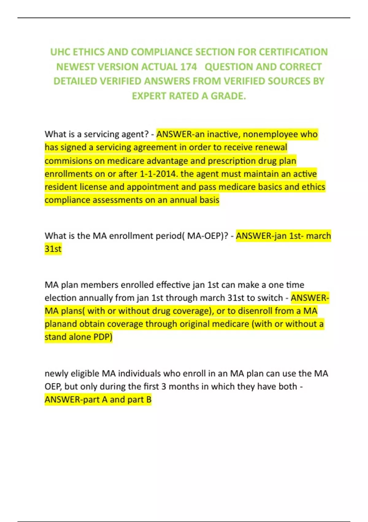 UHC ETHICS AND COMPLIANCE SECTION FOR CERTIFICATION NEWEST VERSION ACTUAL 174 QUESTION AND CORRECT DETAILED VERIFIED ANSWERS FROM VERIFIED SOURCES BY EXPERT RATED A GRADE.