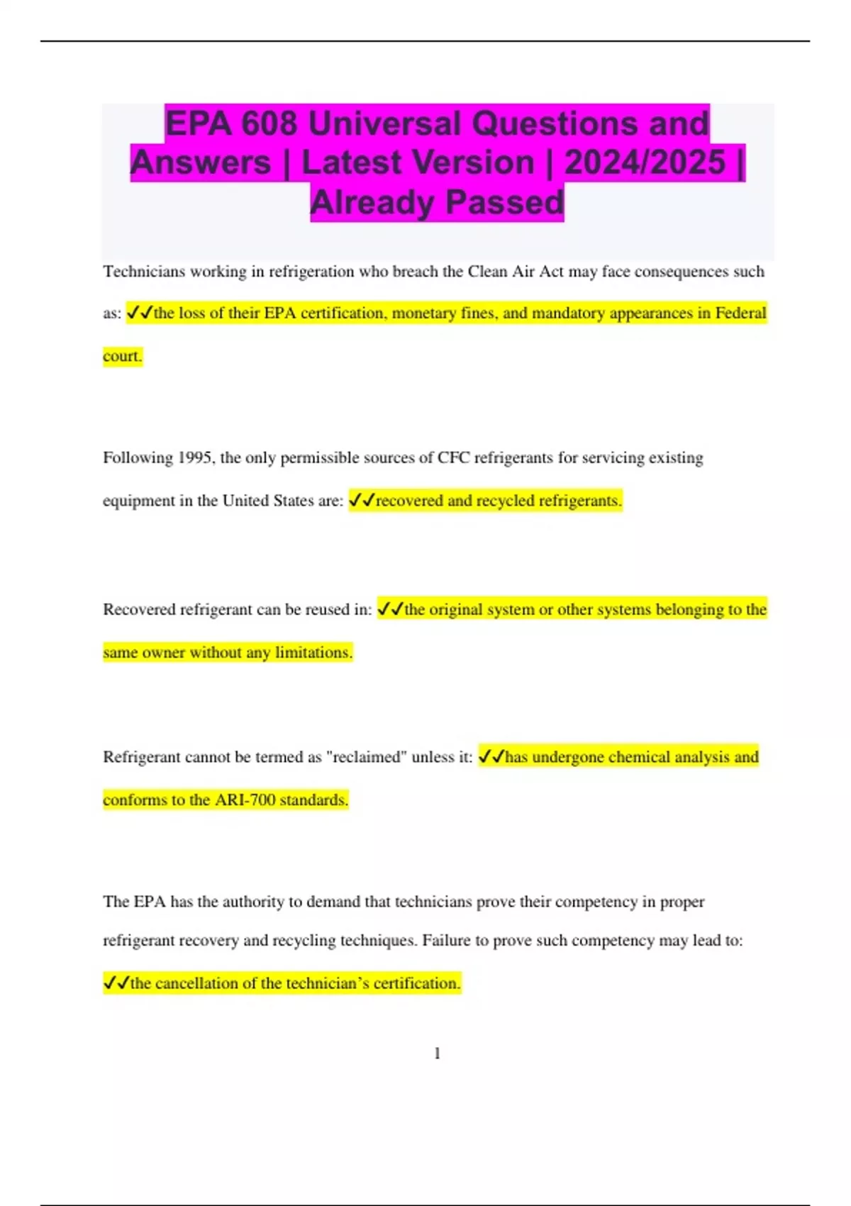 EPA 608 Universal Questions and Answers | Latest Version | 2024/2025 | Already Passed