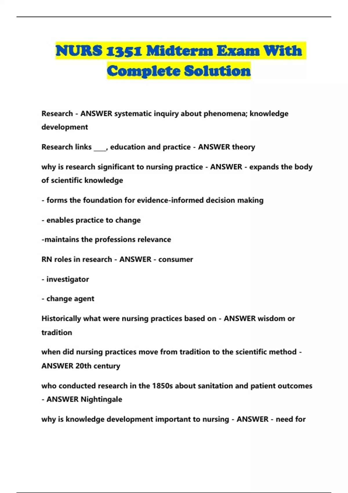 NURS 1351 Midterm Exam With Complete Solution