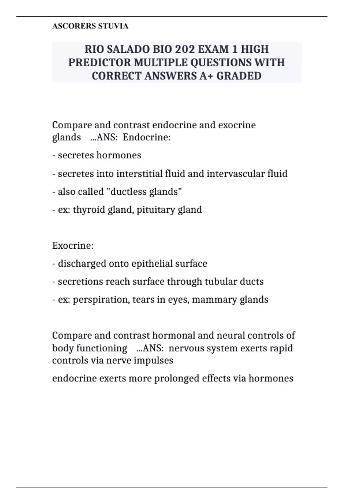 BIO 202 EXAM 1 HIGH PREDICTOR MULTIPLE QUESTIONS WITH CORRECT ANSWERS A+ GRADED