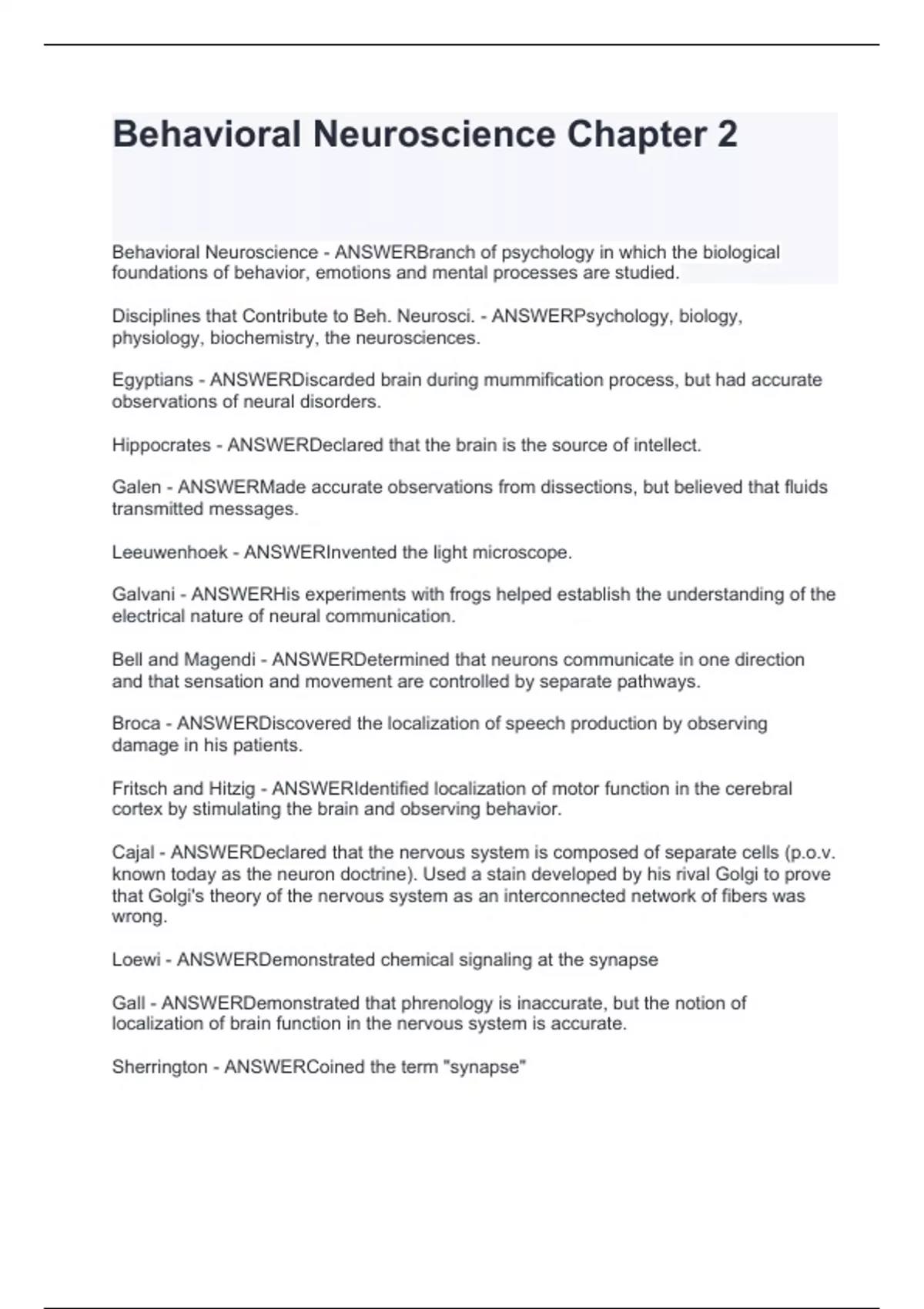 Behavioral Neuroscience Chapter 2.Test with questions and answers 2024