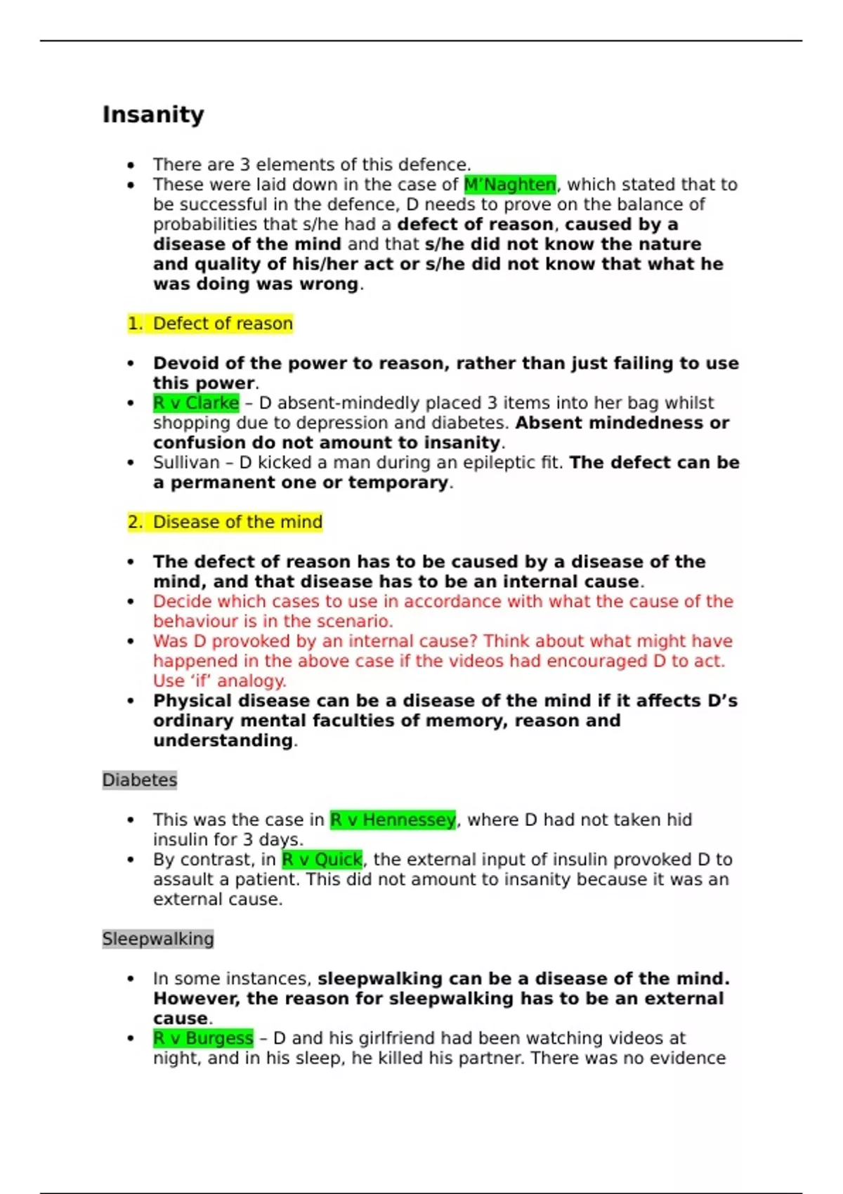 A clearly structured insanity scenario plan. Used for WJEC exam but applicable for other exam boards. Cases are included. A* standard.