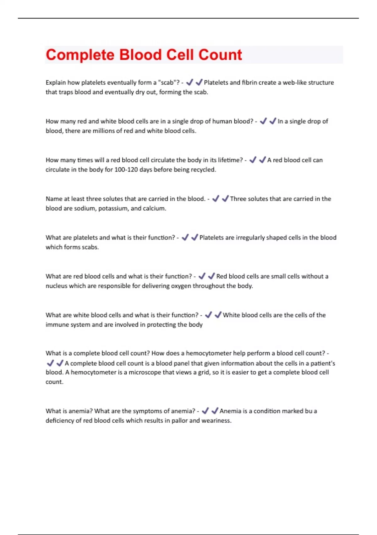 Explain how platelets eventually form a "scab"? - Platelets and fibrin create a web-like structure that traps blood and eventually dry out, forming the scab. How many red and white blood cells are in a single drop of human blood? - In a single drop of blood, there are millions of red and white blood cells. How many times will a red blood cell circulate the body in its lifetime? - A red blood cell can circulate in the body for 100-120 days before being recycled. Name at least three solutes that are carried in the blood. - Three solutes that are carried in the blood are sodium, potassium, and calcium. What are platelets and what is their function? - Platelets are irregularly shaped cells in the blood which forms scabs. What are red blood cells and what is their function? - Red blood cells are small cells without a nucleus which are responsible for delivering oxygen throughout the body. What are white blood cells and what is their function? - White blood cells are the cells of the immune system and are involved in protecting the body What is a complete blood cell count? How does a hemocytometer help perform a blood cell count? - A complete blood cell count is a blood panel that given information about the cells in a patient's blood. A hemocytometer is a microscope that views a grid, so it is easier to get a complete blood cell count. What is anemia? What are the symptoms of anemia? - Anemia is a condition marked bu a deficiency of red blood cells which results in pallor and weariness.What is hemoglobin and why is it an important protein? - Hemoglobin is a protein that is used to carry oxygen through the bloodstream from the lungs to the tissues. This is important for survival. What is the difference between granulocytes and agranulocytes? - Granulocytes consist of granular cytoplasm while agranulocytes do not have this. What is the liquid portion of blood called? What percentage of this liquid is water? - The liquid portion of blood is called plasma; it is 92% water. What type of white blood cell would you expect to see most in a blood sample? - Neutrophils would be the most prominent white blood cell type in a blood sample. Where are blood cells created? - Blood is generated in bone marrow?