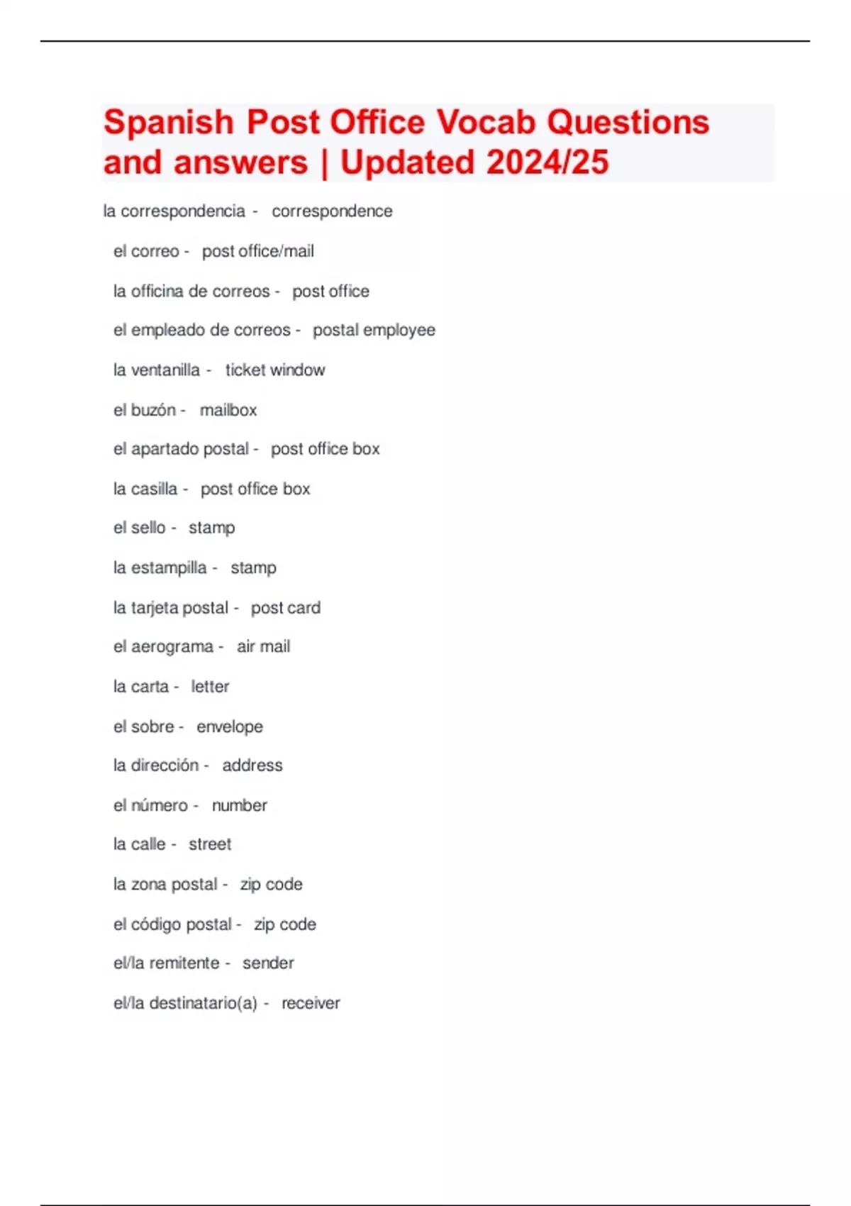 Spanish Post Office Vocab Questions and answers | Updated 2024/25