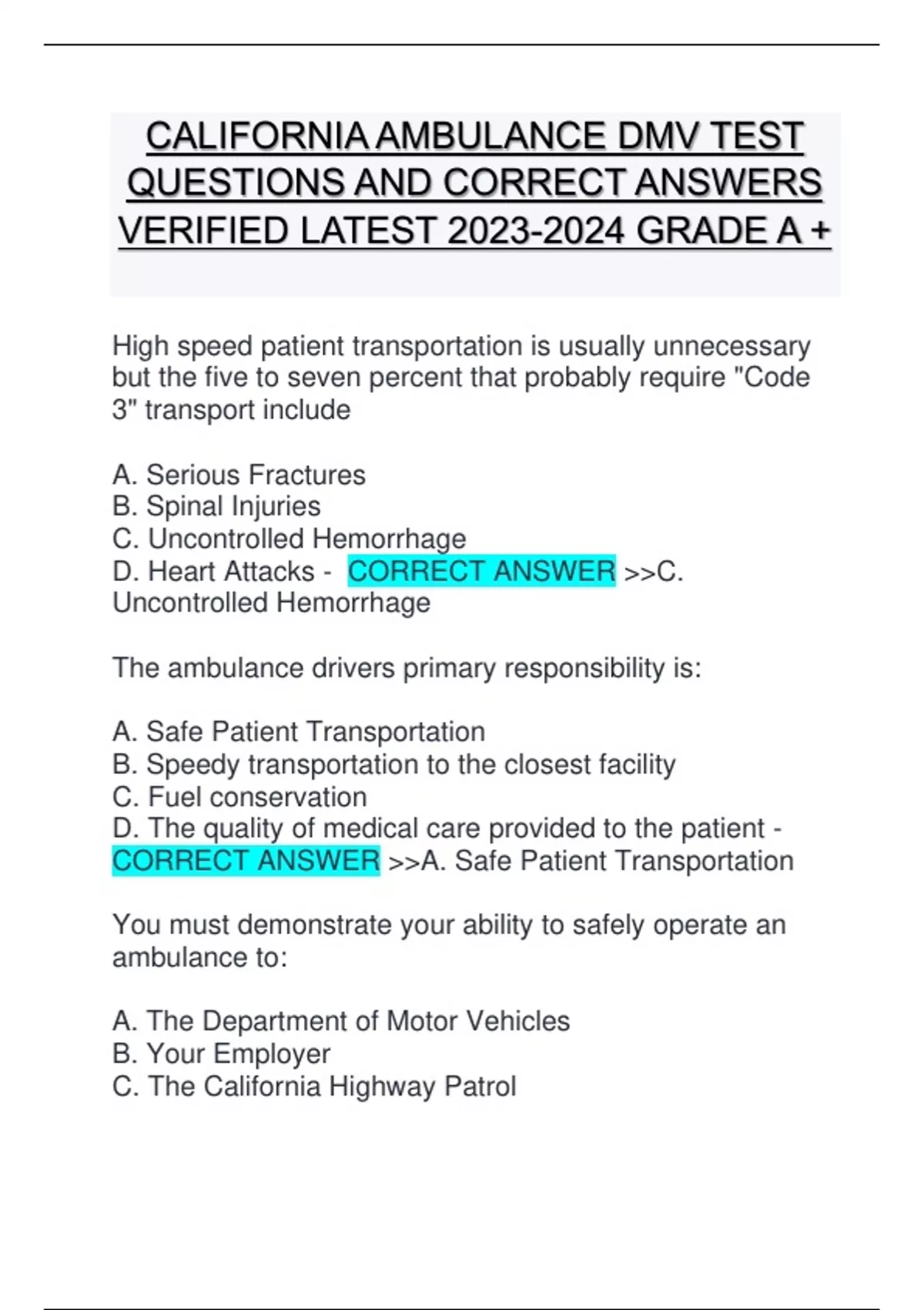 CALIFORNIA AMBULANCE DMV TEST QUESTIONS AND CORRECT ANSWERS VERIFIED LATEST GRADE A +