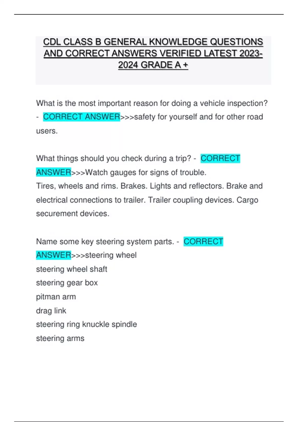CDL CLASS B GENERAL KNOWLEDGE QUESTIONS AND CORRECT ANSWERS VERIFIED LATEST GRADE A + CDL CLASS B GENERAL KNOWLEDGE QUESTIONS AND CORRECT ANSWERS VERIFIED LATEST GRADE A + CDL CLASS B GENERAL KNOWLEDGE QUESTIONS AND CORRECT ANSWERS VERIFIED LATEST GRADE A + CDL CLASS B GENERAL KNOWLEDGE QUESTIONS AND CORRECT ANSWERS VERIFIED LATEST GRADE A + CDL CLASS B GENERAL KNOWLEDGE QUESTIONS AND CORRECT ANSWERS VERIFIED LATEST GRADE A +