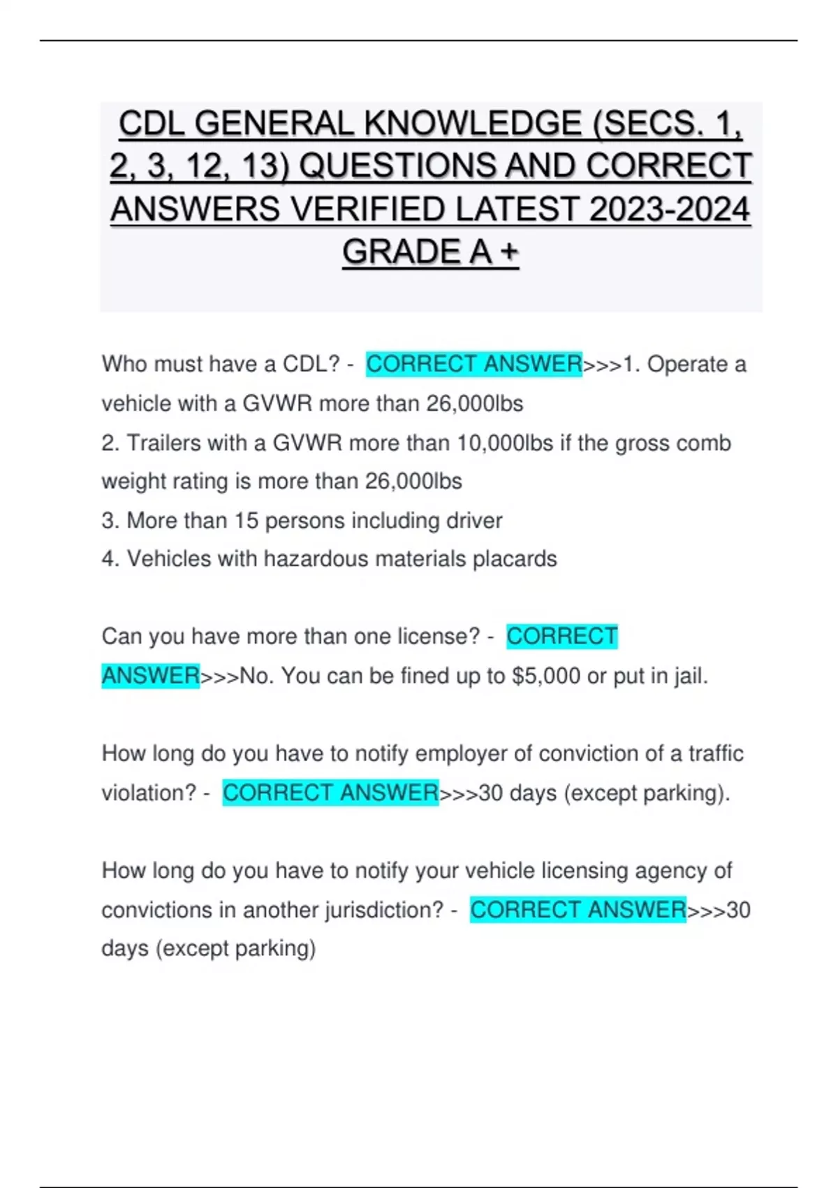 CDL GENERAL KNOWLEDGE (SECS. 1, 2, 3, 12, 13) QUESTIONS AND CORRECT ANSWERS VERIFIED LATEST GRADE A + CDL GENERAL KNOWLEDGE (SECS. 1, 2, 3, 12, 13) QUESTIONS AND CORRECT ANSWERS VERIFIED LATEST GRADE A + CDL GENERAL KNOWLEDGE (SECS. 1, 2, 3, 12, 13) QUESTIONS AND CORRECT ANSWERS VERIFIED LATEST GRADE A + CDL GENERAL KNOWLEDGE (SECS. 1, 2, 3, 12, 13) QUESTIONS AND CORRECT ANSWERS VERIFIED LATEST GRADE A +CDL GENERAL KNOWLEDGE (SECS. 1, 2, 3, 12, 13) QUESTIONS AND CORRECT ANSWERS VERIFIED LATEST GRADE A +
