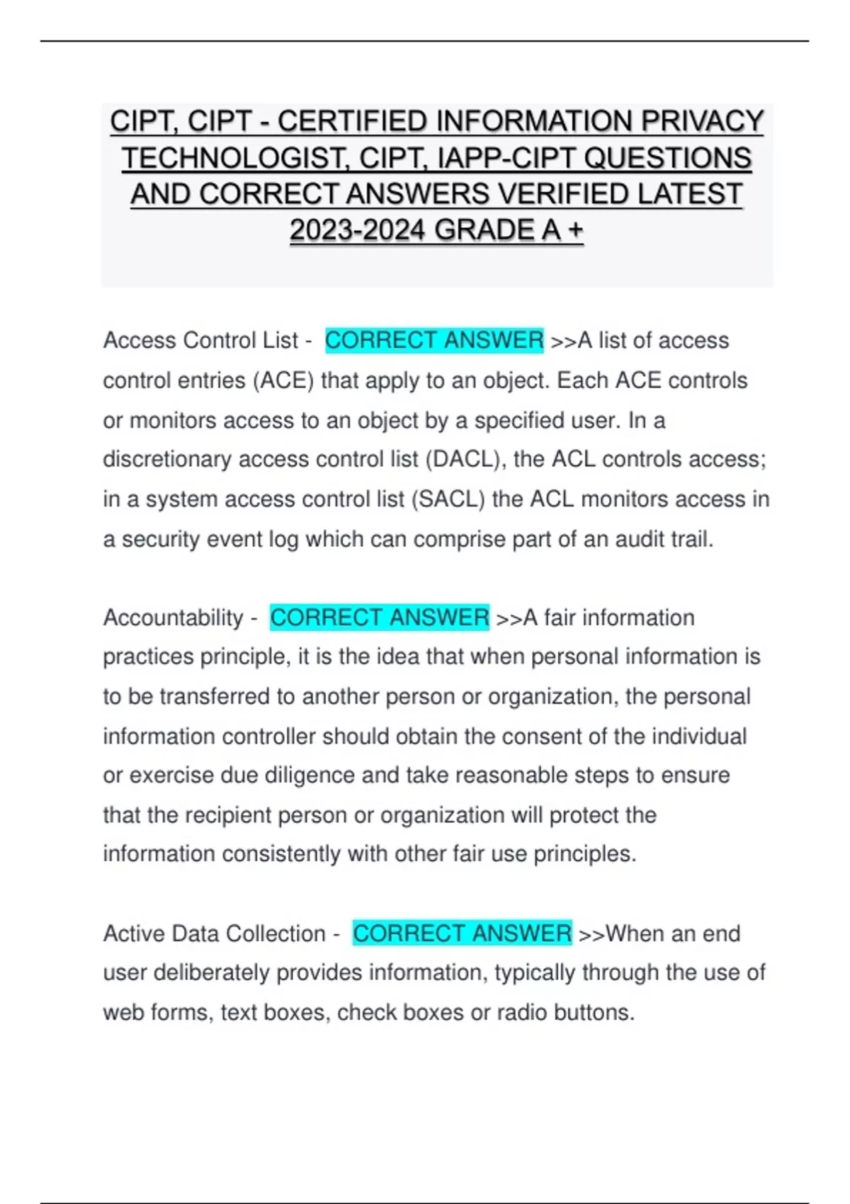 CIPT, CIPT - CERTIFIED INFORMATION PRIVACY TECHNOLOGIST, CIPT, IAPP-CIPT QUESTIONS AND CORRECT ANSWERS VERIFIED LATEST GRADE A +