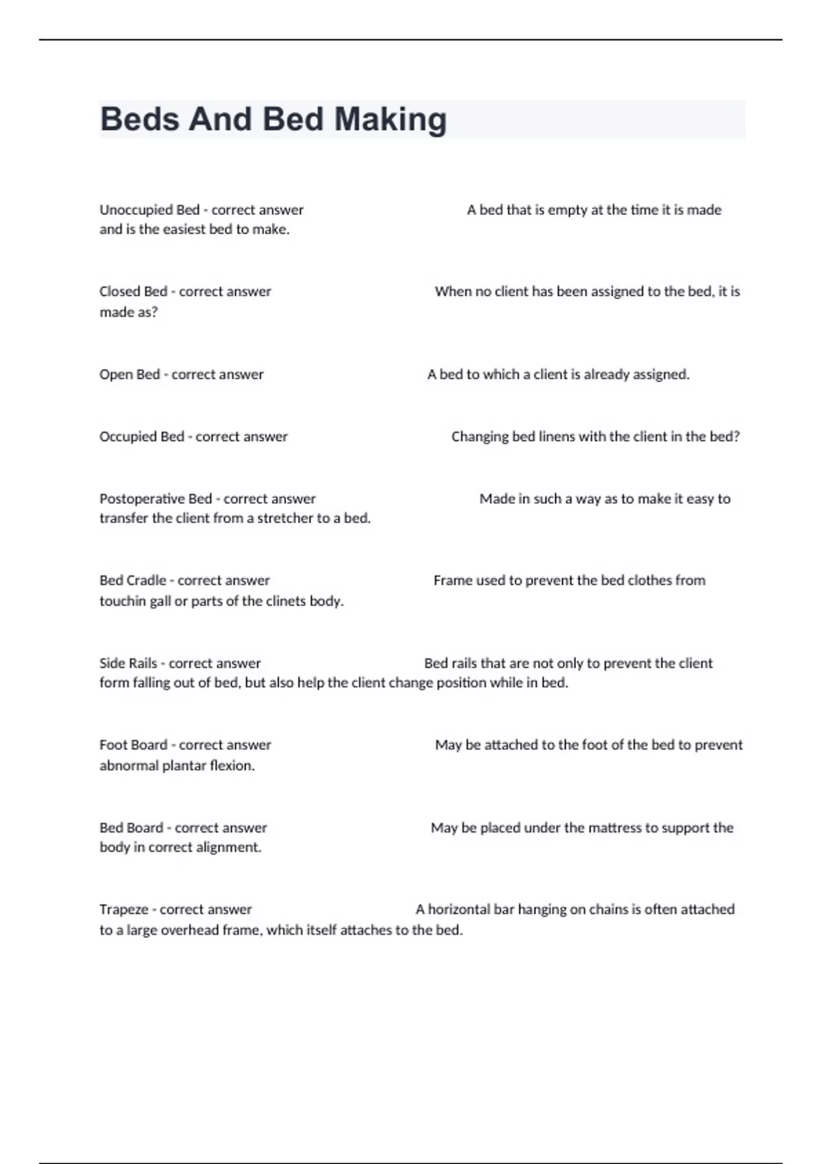 Unoccupied Bed - correct answer A bed that is empty at the time it is made and is the easiest bed to make. Closed Bed - correct answer When no client has been assigned to the bed, it is made as? Open Bed - correct answer A bed to which a client is already assigned. Occupied Bed - correct answer Changing bed linens with the client in the bed? Postoperative Bed - correct answer Made in such a way as to make it easy to transfer the client from a stretcher to a bed. Bed Cradle - correct answer Frame used to prevent the bed clothes from touchin gall or parts of the clinets body. Side Rails - correct answer Bed rails that are not only to prevent the client form falling out of bed, but also help the client change position while in bed. Foot Board - correct answer May be attached to the foot of the bed to prevent abnormal plantar flexion. Bed Board - correct answer May be placed under the mattress to support the body in correct alignment. Trapeze - correct answer A horizontal bar hanging on chains is often attached to a large overhead frame, which itself attaches to the bed. Traction - correct answer Consist of a series of ropes, pulleys, and weights that serve to keep a body part in proper alignment. Egg Crate Mattress - correct answer Foam rubber with a surface that is shaped like a egg carton. Flotation Mattress - correct answer Contains a special gel-type material, which supports the body or body part in such a way as to avoid creating pressure points. Therapeutic beds - correct answer Used to treat clients with severe joint contractures, prolonged immobility, or skin wounds such as pressure ulcers or severe burns. Orthopedic beds - correct answer Supports a client who must remain immobilized. TheraPulse ATP - correct answer Alternating pressure bed rotates air pockets, to reduce the possibility of developing pressure areas. Circ-O-Lectric - correct answer Circle bed turns the client from front (prone) to back (supine) rotation around the feet.