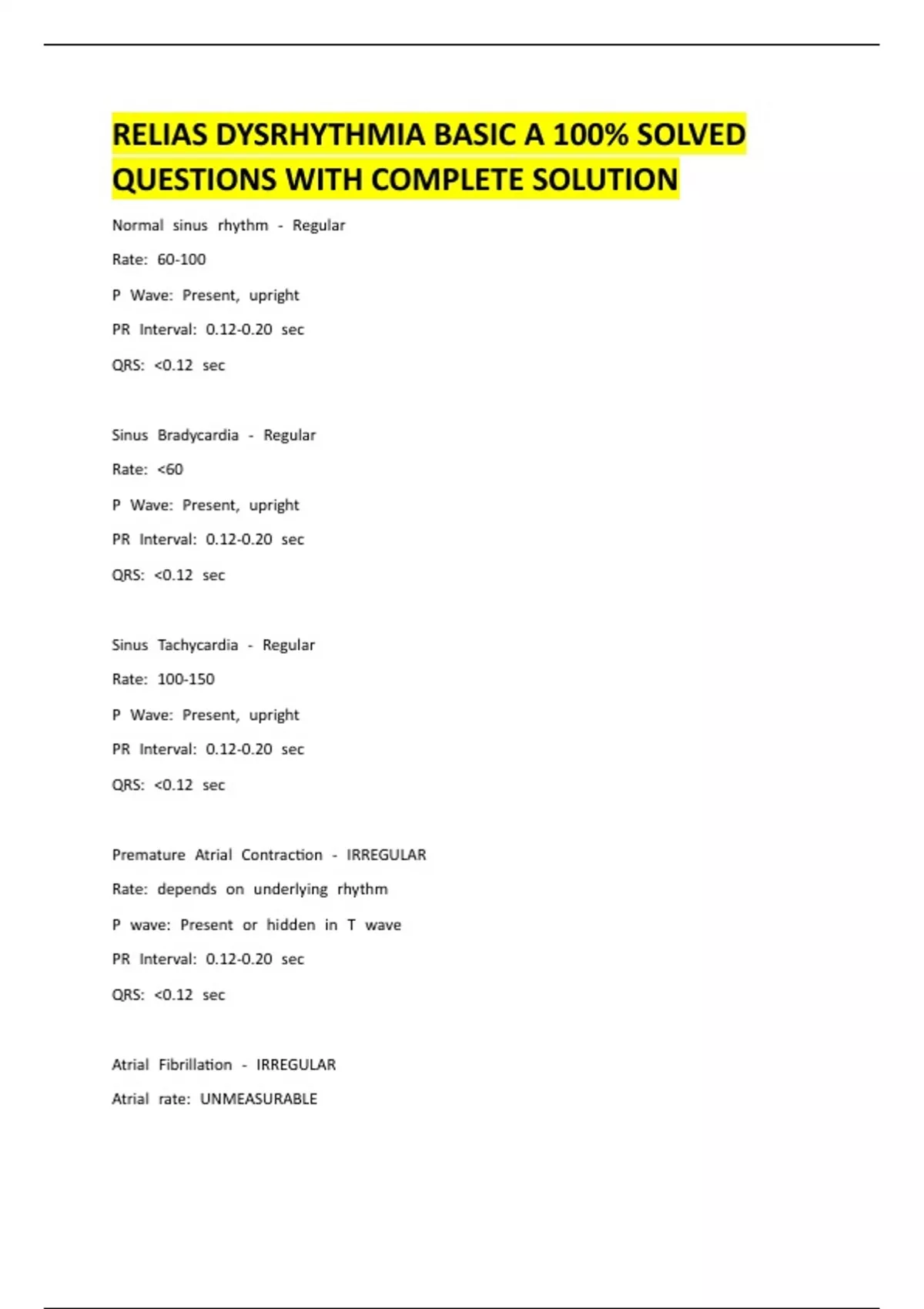 RELIAS DYSRHYTHMIA BASIC A 100% SOLVED QUESTIONS WITH COMPLETE SOLUTION Normal sssinus ssrhythm ss- ssRegular Rate: ss60-100 P ssWave: ssPresent, ssupright PR ssInterval: ss0.12 -0.20 sssec QRS: ss<0.12 sssec Sinus ssBradycardia ss- ssRegular Rate: ss<60 ss P ssWave: ssPresent, ssupright PR ssInterval: ss0.12 -0.20 sssec QRS: ss<0.12 sssec Sinus ssTachycardia ss- ssRegular Rate: ss100-150 P ssWave: ssPresent, ssupright PR ssInterval: ss0.12 -0.20 sssec QRS: ss<0.12 sssec Premature ssAtrial ssContraction ss- ssIRREGULAR Rate: ssdepends sson ssunderlying ssrhythm ss P sswave: ssPresent ssor sshidden ssin ssT sswave PR ssInterval: ss0.12 -0.20 sssec QRS: ss<0.12 sssec Atrial ssFibrillation ss- ssIRREGULAR Atrial ssrate: ssUNMEASURABLE Ventricular ssrate: ssvariable P sswave: ssunable ssto sssee PR ssInterval: ssN/A QRS: ss<0.12 sssec A ssfib ssRVR ss- ssIRREGULAR Ventricular ssrate: ss100-175 ss P sswave: ssunable ssto sssee PR ssInterval: ssN/A QRS ss<0.12 sssec Atrial ssFlutter ss- ssUsually ssREGULAR sscan ssbe ssirregular ss Atrial ssrate: ss250-350 Ventricular ssrate: ssvariable ssBUT ss< ssatrial ssrate P ssWave: ssFlutter PR ssInterval: ssN/A QRS: ss<0.12 sssec Supraventricular ssTachycardia ss- ssRegular Rate: ss150-350 P sswave: ssHidden ssin ssQRS ssor ssT sswave PR: ssunable ssto ssdetermine QRS: ss<0.12 sssec Junctional ssRhythm ss- ssRegular Rate: ss40-60 P ssWave: ssABSENT ssor ssINVERTED ss PR ssInterval: ssNone ssor ss<0.12 QRS: ss<0.12 sssec