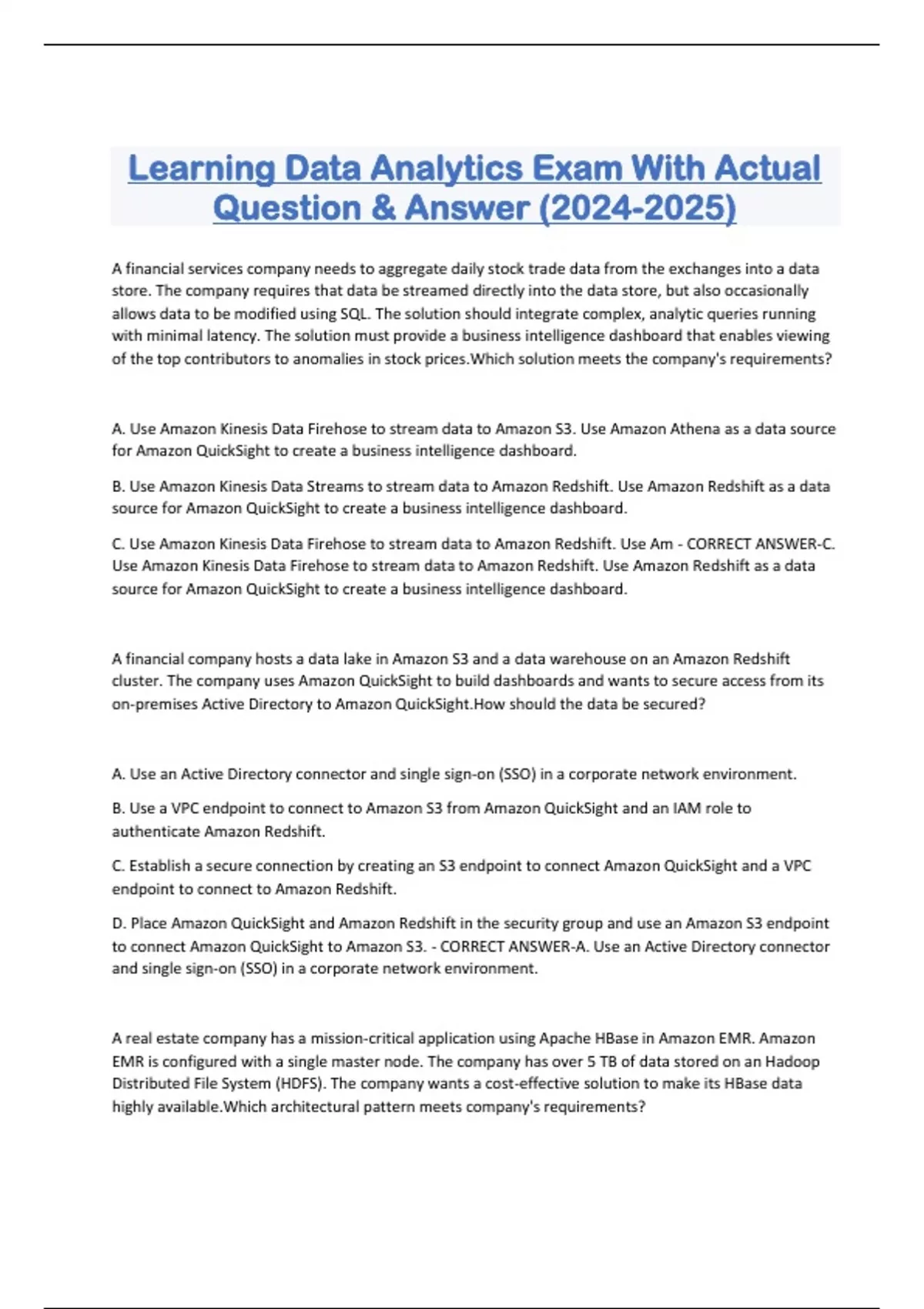 Learning Data Analytics Exam With Actual Question & Answer () A financial services company needs to aggregate daily stock trade data from the exchanges into a data store. The company requires that data be streamed directly into the data store, but also occasionally allows data to be modified using SQL. The solution should integrate complex, analytic queries running with minimal latency. The solution must provide a business intelligence dashboard that enables viewing of the top contributors to anomalies in stock prices.Which solution meets the company's requirements? A. Use Amazon Kinesis Data Firehose to stream data to Amazon S3. Use Amazon Athena as a data source for Amazon QuickSight to create a business intelligence dashboard. B. Use Amazon Kinesis Data Streams to stream data to Amazon Redshift. Use Amazon Redshift as a data source for Amazon QuickSight to create a business intelligence dashboard. C. Use Amazon Kinesis Data Firehose to stream data to Amazon Redshift. Use Am - CORRECT ANSWER-C. Use Amazon Kinesis Data Firehose to stream data to Amazon Redshift. Use Amazon Redshift as a data source for Amazon QuickSight to create a business intelligence dashboard
