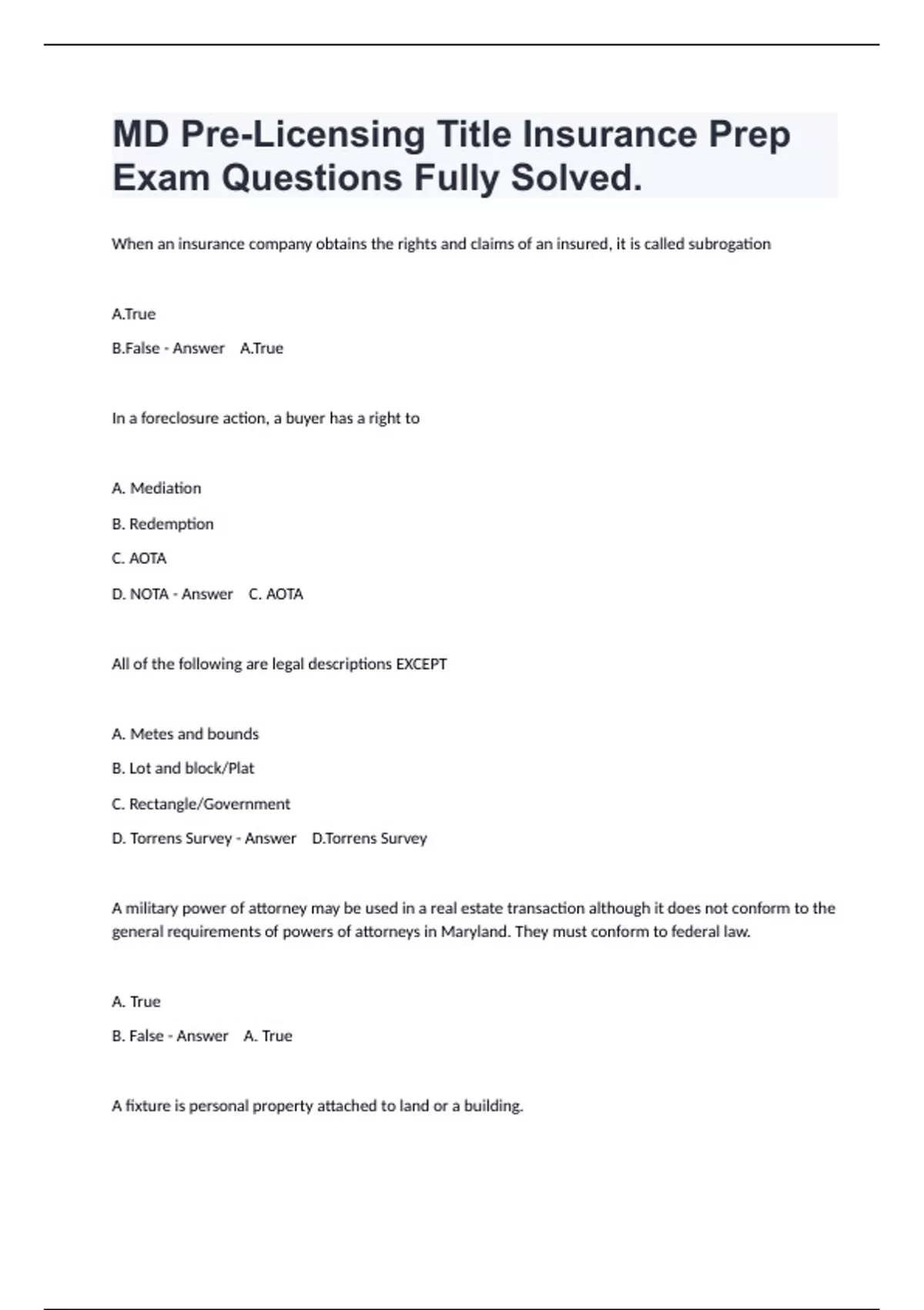When an insurance company obtains the rights and claims of an insured, it is called subrogation A.True B.False - Answer A.True In a foreclosure action, a buyer has a right to A. Mediation B. Redemption C. AOTA D. NOTA - Answer C. AOTA All of the following are legal descriptions EXCEPT A. Metes and bounds B. Lot and block/Plat C. Rectangle/Government D. Torrens Survey - Answer D.Torrens Survey A military power of attorney may be used in a real estate transaction although it does not conform to the general requirements of powers of attorneys in Maryland. They must conform to federal law. A. True B. False - Answer A. True A fixture is personal property attached to land or a building.
