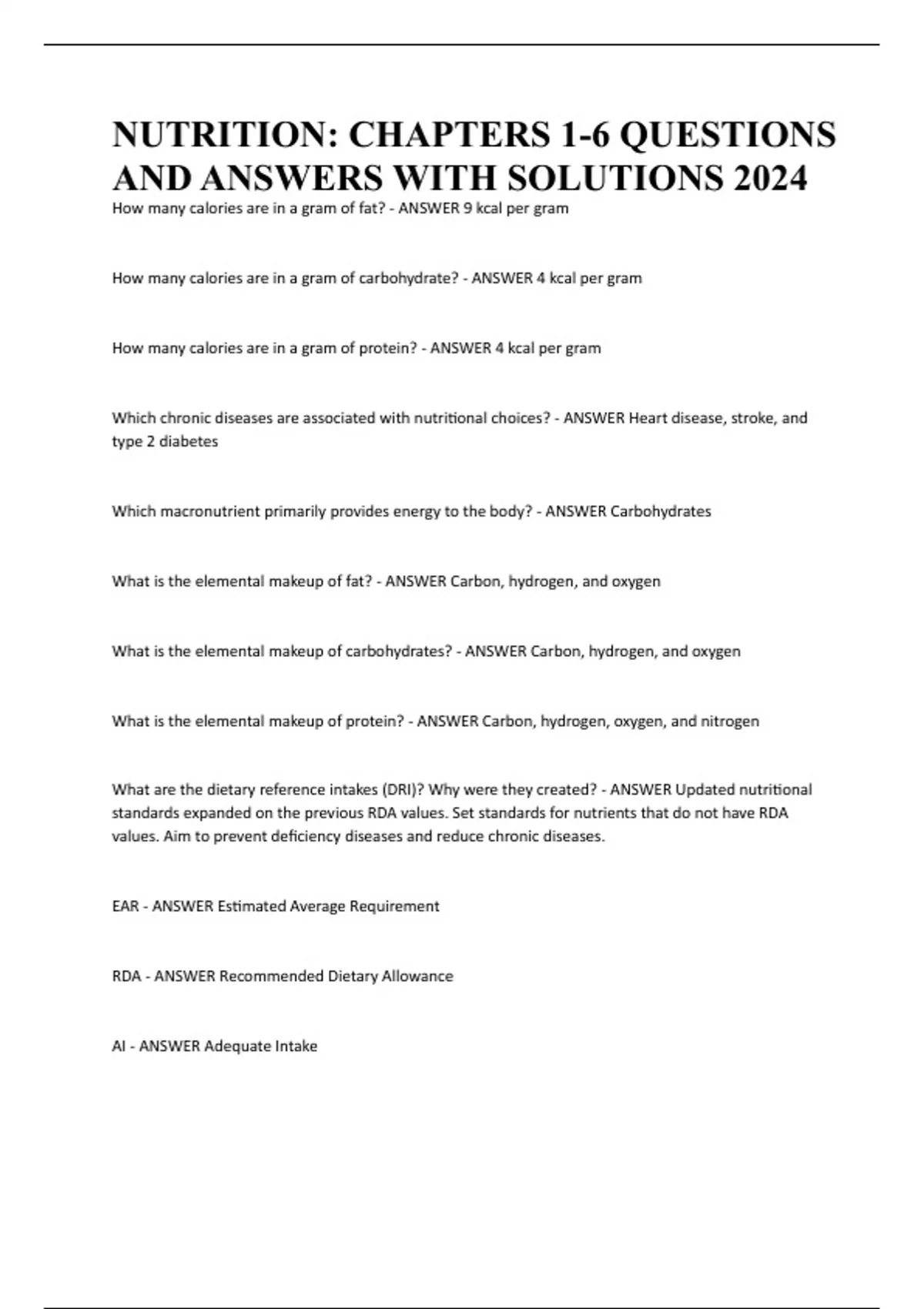 NUTRITION: CHAPTERS 1-6 QUESTIONS AND ANSWERS WITH SOLUTIONS 2024