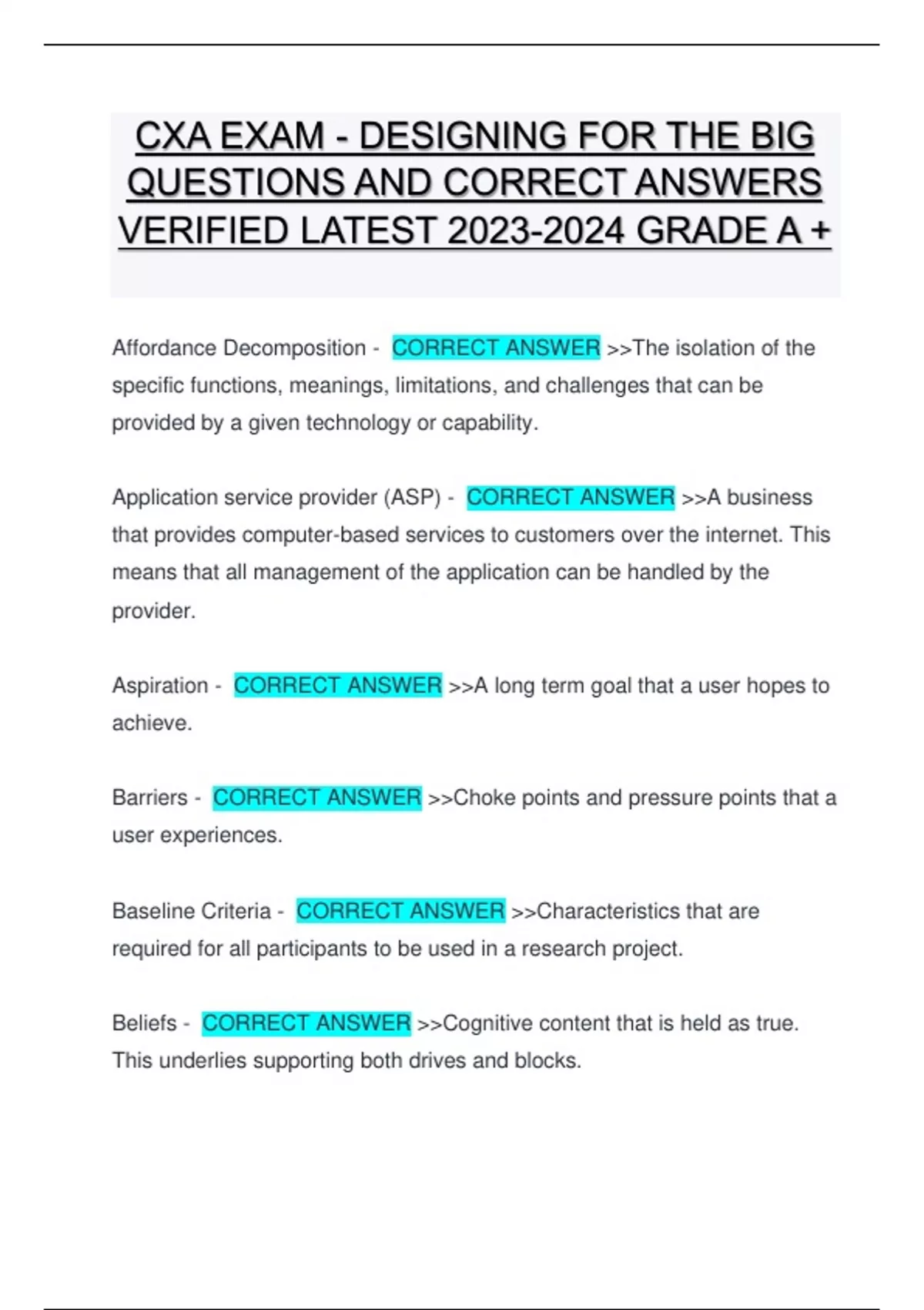 CXA EXAM - DESIGNING FOR THE BIG QUESTIONS AND CORRECT ANSWERS VERIFIED LATEST GRADE A + CXA EXAM - DESIGNING FOR THE BIG QUESTIONS AND CORRECT ANSWERS VERIFIED LATEST GRADE A + CXA EXAM - DESIGNING FOR THE BIG QUESTIONS AND CORRECT ANSWERS VERIFIED LATEST GRADE A +CXA EXAM - DESIGNING FOR THE BIG QUESTIONS AND CORRECT ANSWERS VERIFIED LATEST GRADE A +CXA EXAM - DESIGNING FOR THE BIG QUESTIONS AND CORRECT ANSWERS VERIFIED LATEST GRADE A +