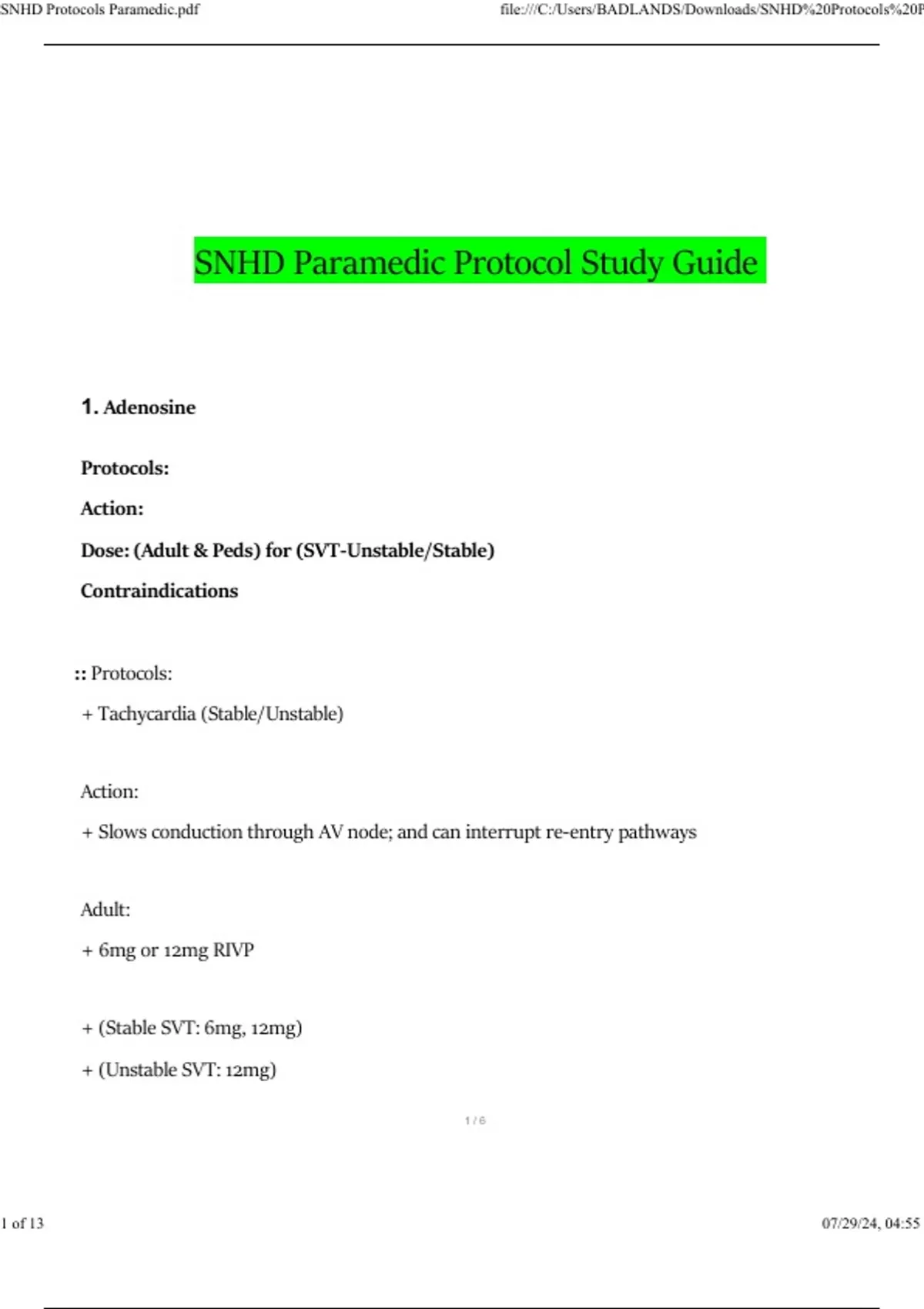 SNHD Paramedic Protocol Study Guide Questions and Answers Updated (Verified Answers)