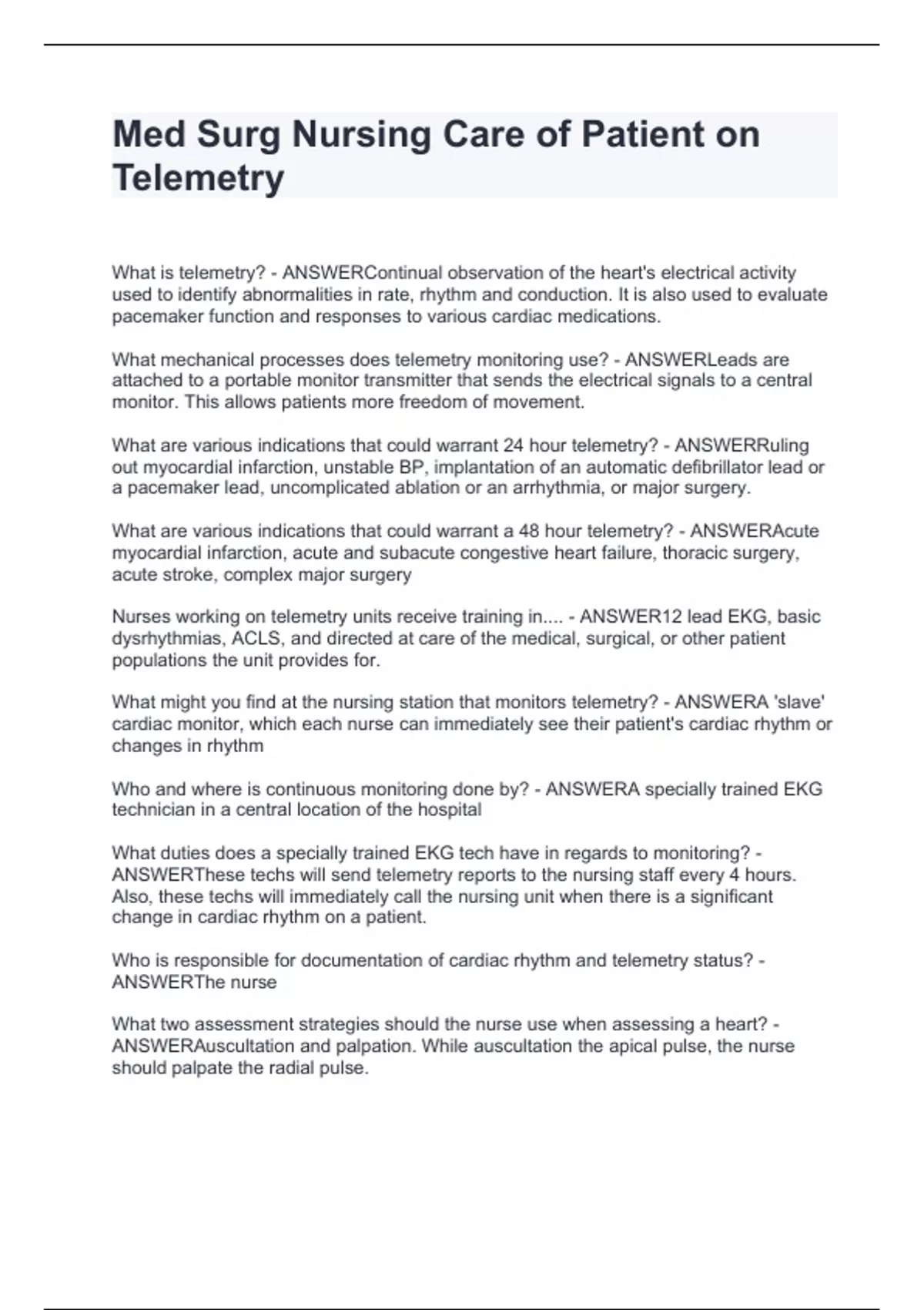 Med Surg Nursing Care of Patient on Telemetry.Final questions with solutions 2024
