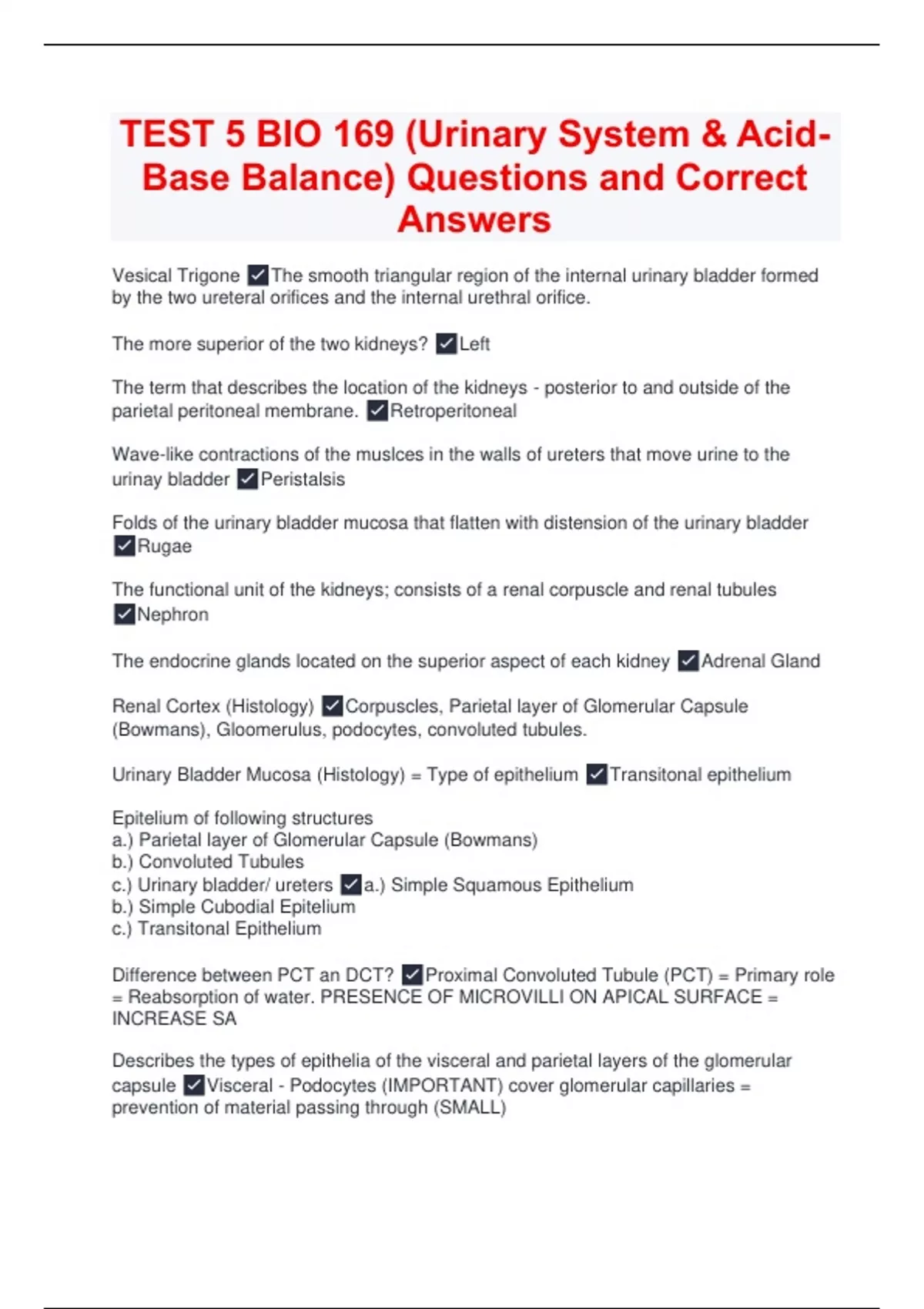TEST 5 BIO 169 (Urinary System & Acid-Base Balance) Questions and Correct Answers