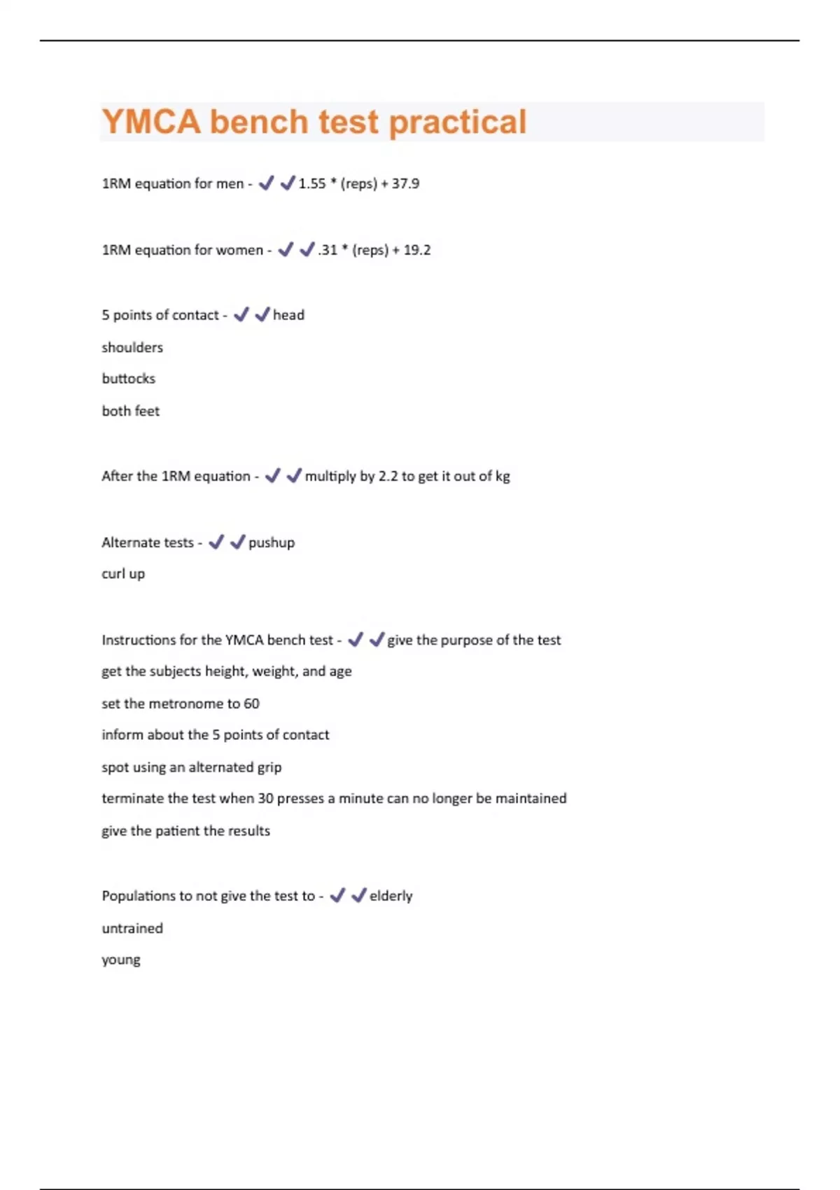 1RM equation for men - 1.55 * (reps) + 37.9 1RM equation for women - .31 * (reps) + 19.2 5 points of contact - head shoulders buttocks both feet After the 1RM equation - multiply by 2.2 to get it out of kg Alternate tests - pushup curl up Instructions for the YMCA bench test - give the purpose of the test get the subjects height, weight, and age set the metronome to 60 inform about the 5 points of contact spot using an alternated grip terminate the test when 30 presses a minute can no longer be maintained give the patient the results Populations to not give the test to - elderly untrained youngPurpose of the YMCA bench press test - to test for muscular endurance of the upper body Weight used in the YMCA bench test - men = 80 pounds women = 35 pounds