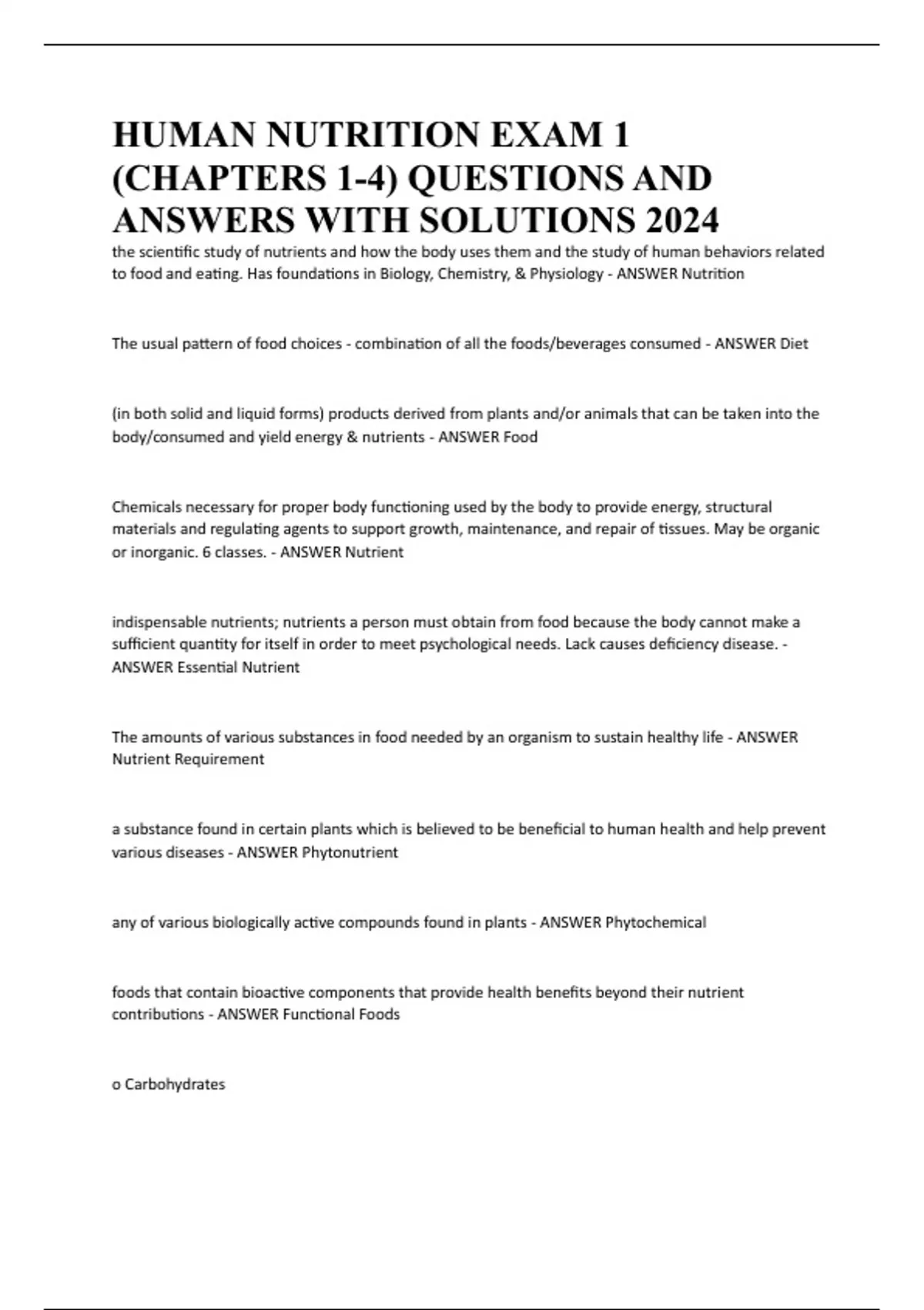 HUMAN NUTRITION EXAM 1 (CHAPTERS 1-4) QUESTIONS AND ANSWERS WITH SOLUTIONS 2024