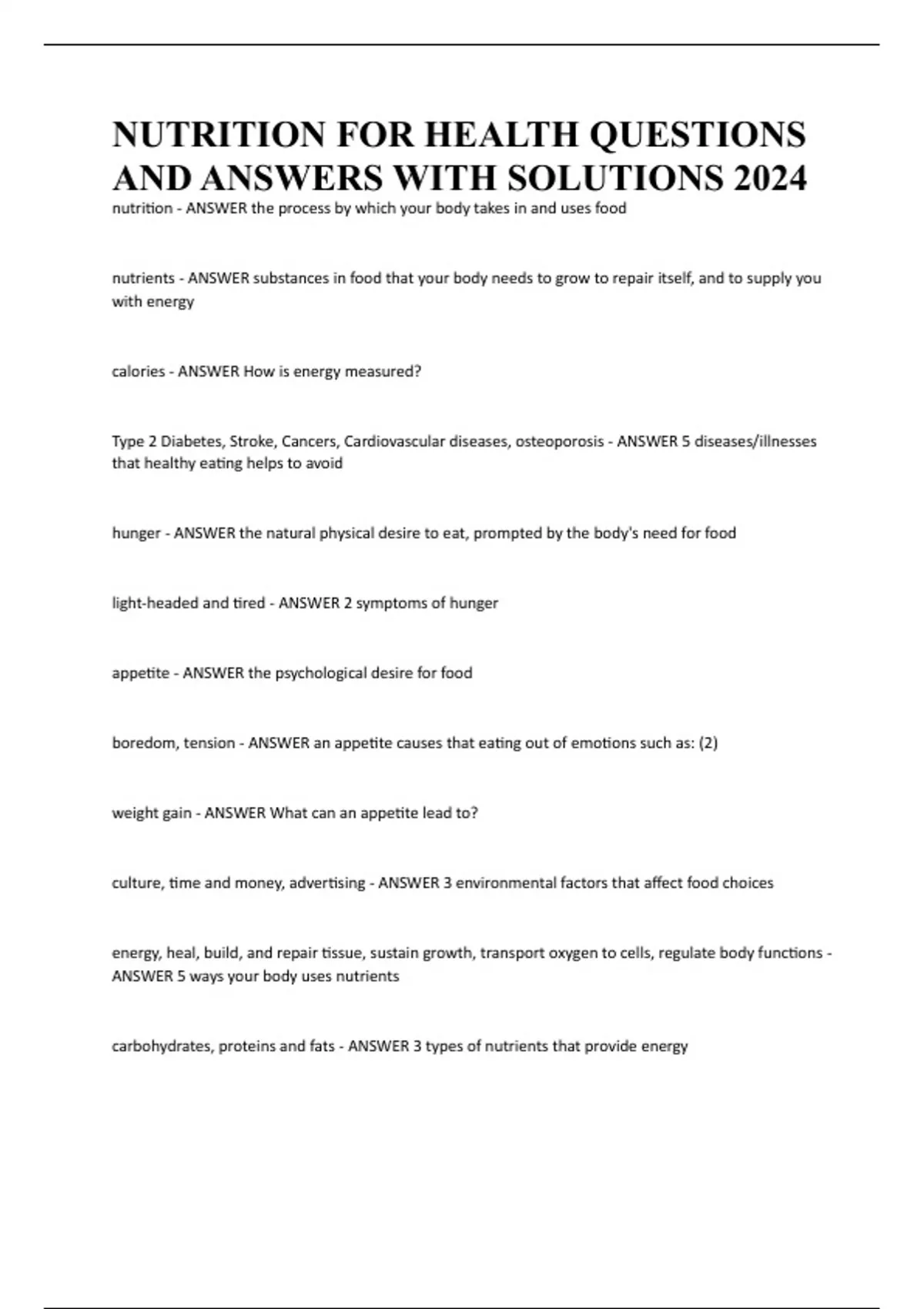 NUTRITION FOR HEALTH QUESTIONS AND ANSWERS WITH SOLUTIONS 2024