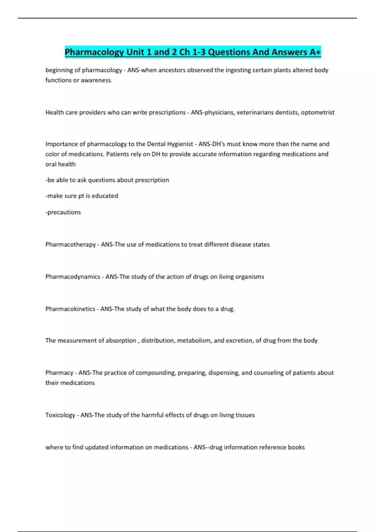 Pharmacology Unit 1 and 2 Ch 1-3 Questions And Answers A+ beginning of pharmacology - ANS-when ancestors observed the ingesting certain plants altered body functions or awareness. Health care providers who can write prescriptions - ANS-physicians, veterinarians dentists, optometrist Importance of pharmacology to the Dental Hygienist - ANS-DH's must know more than the name and color of medications. Patients rely on DH to provide accurate information regarding medications and oral health -be able to ask questions about prescription -make sure pt is educated -precautions Pharmacotherapy - ANS-The use of medications to treat different disease states Pharmacodynamics - ANS-The study of the action of drugs on living organisms Pharmacokinetics - ANS-The study of what the body does to a drug. The measurement of absorption , distribution, metabolism, and excretion, of drug from the body Pharmacy - ANS...