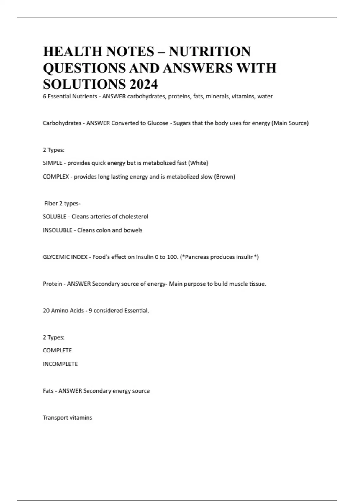 HEALTH NOTES – NUTRITION QUESTIONS AND ANSWERS WITH SOLUTIONS 2024