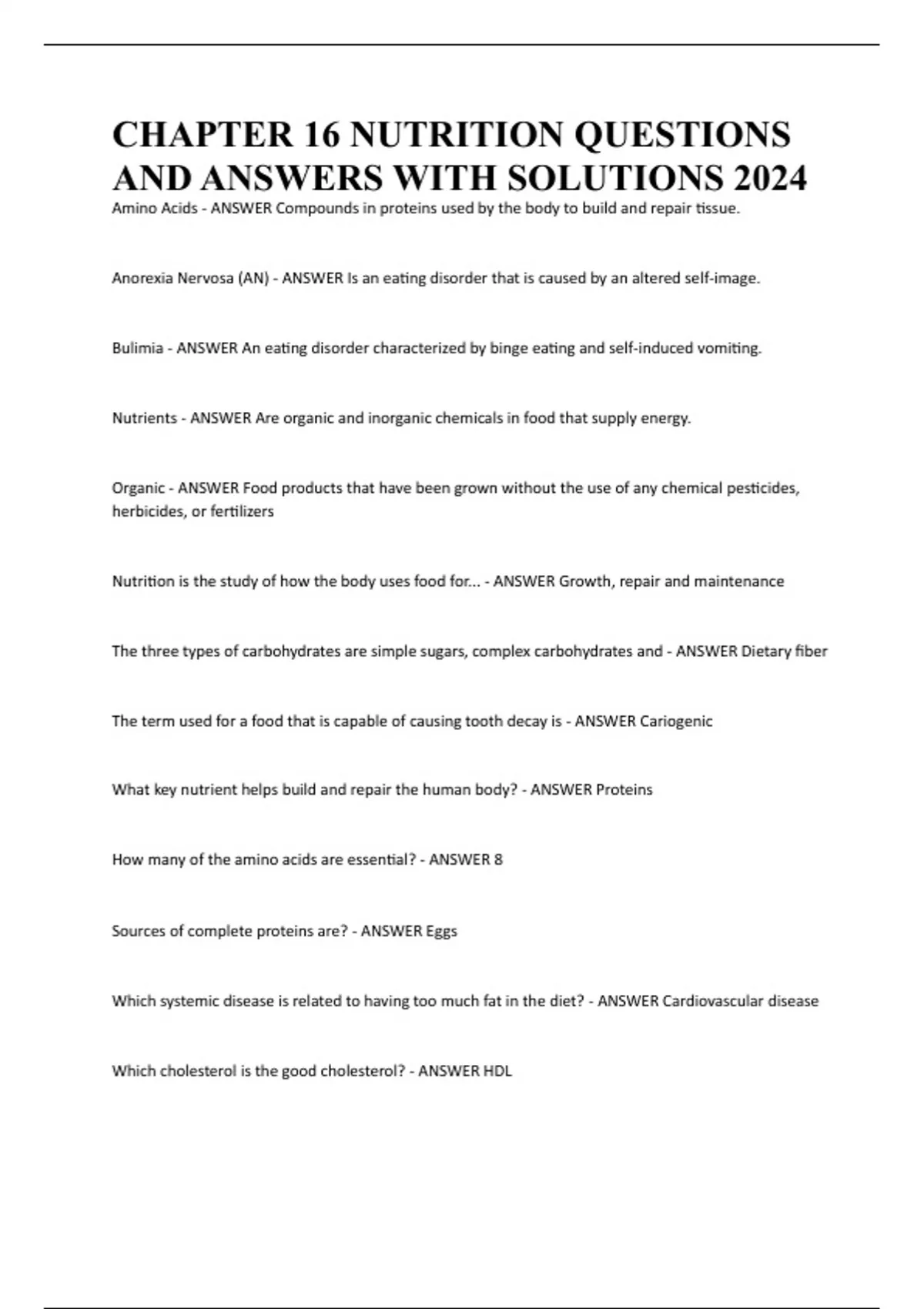 CHAPTER 16 NUTRITION QUESTIONS AND ANSWERS WITH SOLUTIONS 2024