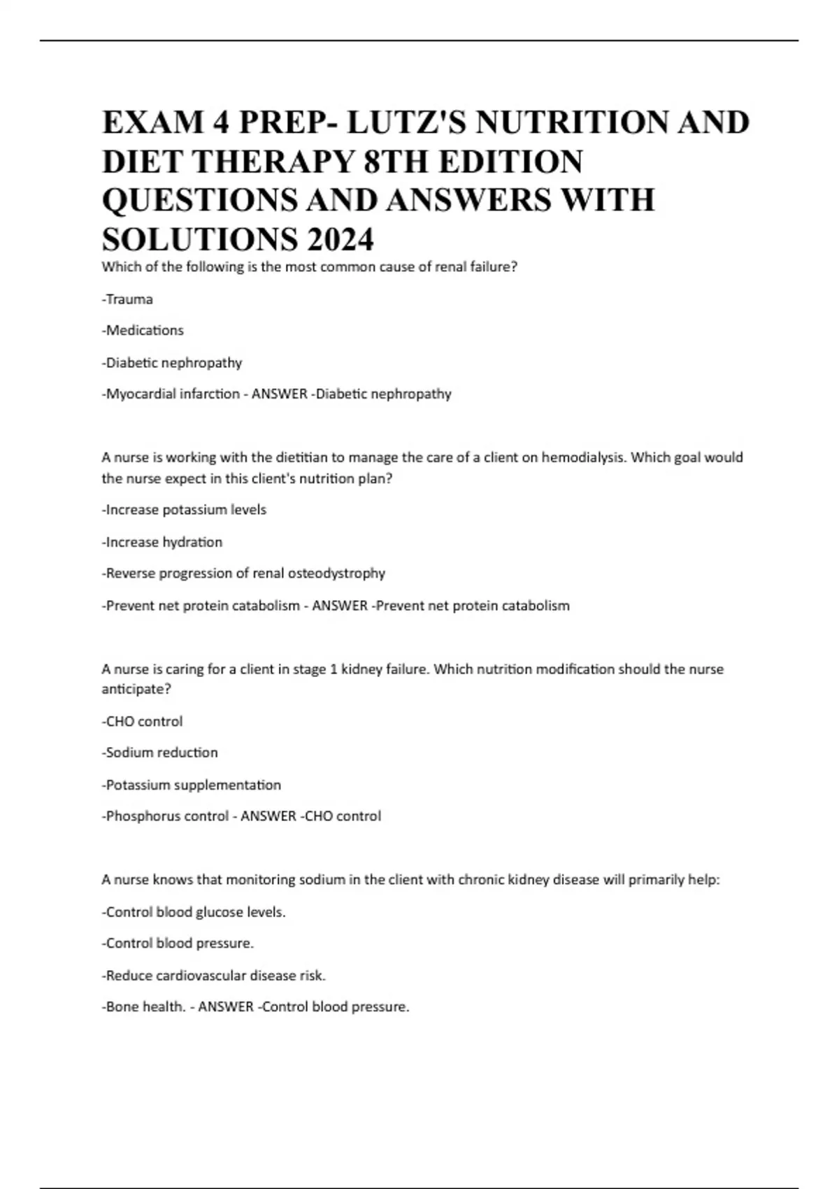 EXAM 4 PREP- LUTZ'S NUTRITION AND DIET THERAPY 8TH EDITION QUESTIONS AND ANSWERS WITH SOLUTIONS 2024