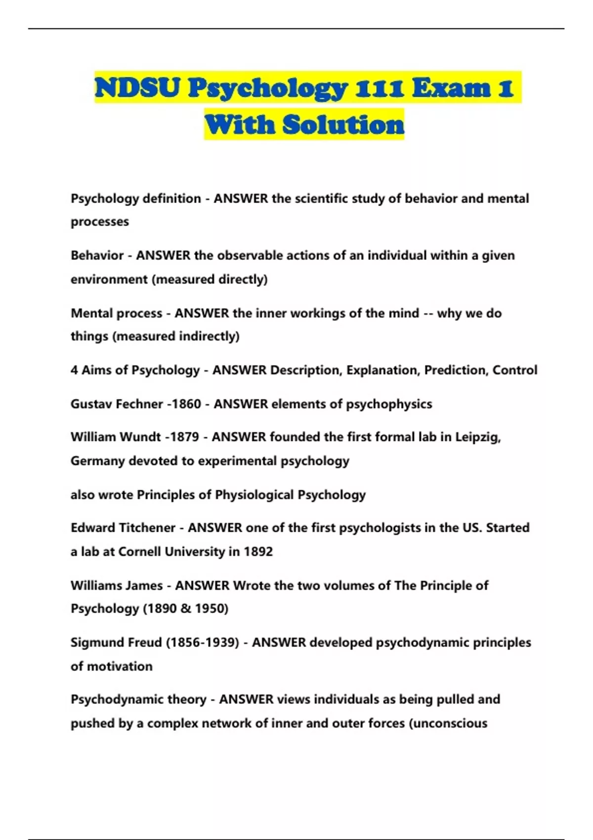 NDSU PSYCH 111 BUNDLED EXAMS WITH SOLUTION