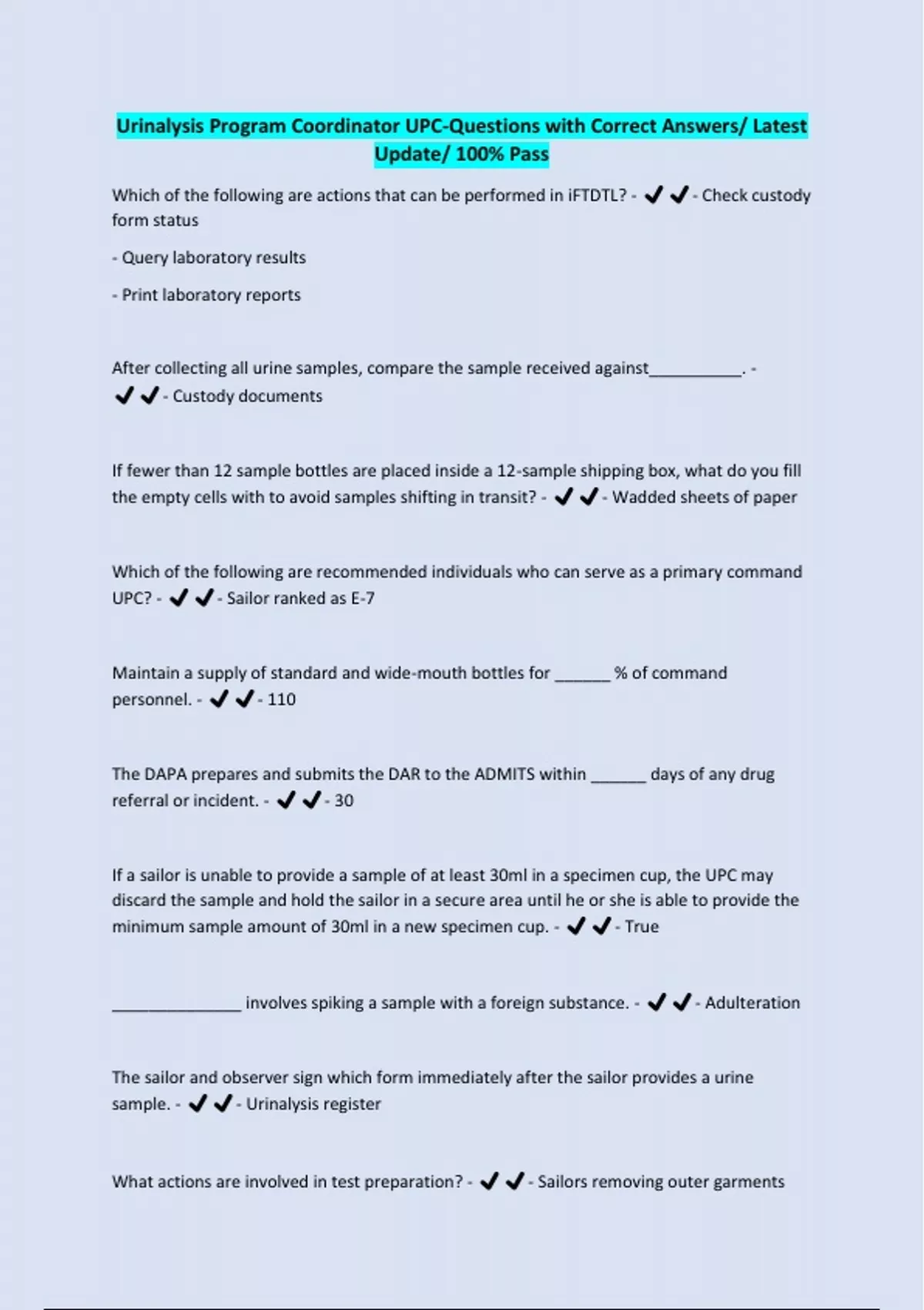 Urinalysis Program Coordinator UPC-Questions with Correct Answers/ Latest Update/ 100% Pass