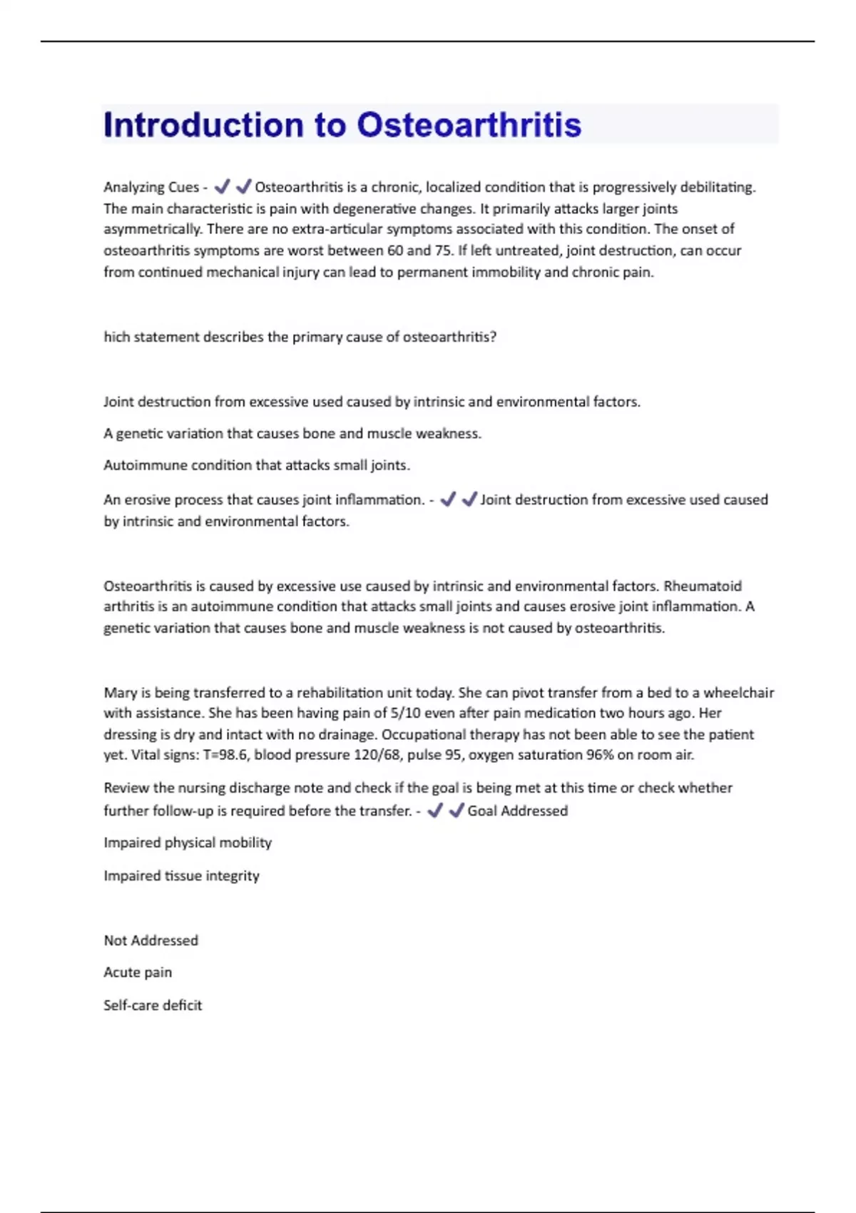Analyzing Cues - Osteoarthritis is a chronic, localized condition that is progressively debilitating. The main characteristic is pain with degenerative changes. It primarily attacks larger joints asymmetrically. There are no extra-articular symptoms associated with this condition. The onset of osteoarthritis symptoms are worst between 60 and 75. If left untreated, joint destruction, can occur from continued mechanical injury can lead to permanent immobility and chronic pain. hich statement describes the primary cause of osteoarthritis? Joint destruction from excessive used caused by intrinsic and environmental factors. A genetic variation that causes bone and muscle weakness. Autoimmune condition that attacks small joints. An erosive process that causes joint inflammation. - Joint destruction from excessive used caused by intrinsic and environmental factors. Osteoarthritis is caused by excessive use caused by intrinsic and environmental factors. Rheumatoid arthritis is an autoimmune condition that attacks small joints and causes erosive joint inflammation. A genetic variation that causes bone and muscle weakness is not caused by osteoarthritis. Mary is being transferred to a rehabilitation unit today. She can pivot transfer from a bed to a wheelchair with assistance. She has been having pain of 5/10 even after pain medication two hours ago. Her dressing is dry and intact with no drainage. Occupational therapy has not been able to see the patient yet. Vital signs: T=98.6, blood pressure 120/68, pulse 95, oxygen saturation 96% on room air. Review the nursing discharge note and check if the goal is being met at this time or check whether further follow-up is required before the transfer. - Goal Addressed Impaired physical mobility Impaired tissue integrity Not Addressed Acute pain Self-care deficitPatient's physical therapist has taught transfer techniques and will continue treatment in rehabilitation unit. The pain does not appear to be controlled at this time and requires further nursing action. The surgical incision appears to be normal and healing well. The patient has not seen the occupational therapist, which should be done before discharge. n analyzing the patient record, which assessment items are consistent with degenerative joint disease caused by osteoarthritis? Select all that apply. Unilateral joint pain Erythema Edema Joint deformity Crepitus - Unilateral joint pain joint deformity crepitus Osteoarthritis can present to joint pain, deformity, and crepitus. Erythema and edema are only usually present after significant overuse. Nurses Progress Note: At 1400, Linda is voicing pain in right knee. Vitals: BP-152/88, P-102, R-22. Oxygen saturation 96%. She describes it as a soreness with intermittent throbbing. The nurse asks her to identify her pain on a numeric pain scale, which she describes as 5/10. Which prescribed medication would have the least likelihood of adverse effects? Celecoxib 200mg PO twice daily Diclofenac 1% gel 4 grams four times daily Morphine 4mg IV q2 hours for severe pain Ibuprofen 1000mg PO every 6 hours - Diclofenac 1% gel 4 grams four times dailyThe topical gel has the best safety profile because it is localized, topical, and has limited side effects compared to the other medications. Morphine can cause respiratory depression. Ibuprofen can cause gastritis. Celecoxib has fewer side effects but is not as safe as the diclofenac gel. Nursing Actions - Osteoarthritis - Orders Nursing diagnosis Physical therapy referral Impaired physical mobility Oxycodone/apap Acute pain Dressing changes Impaired tissue integrity Occupational health referral Self-care deficit