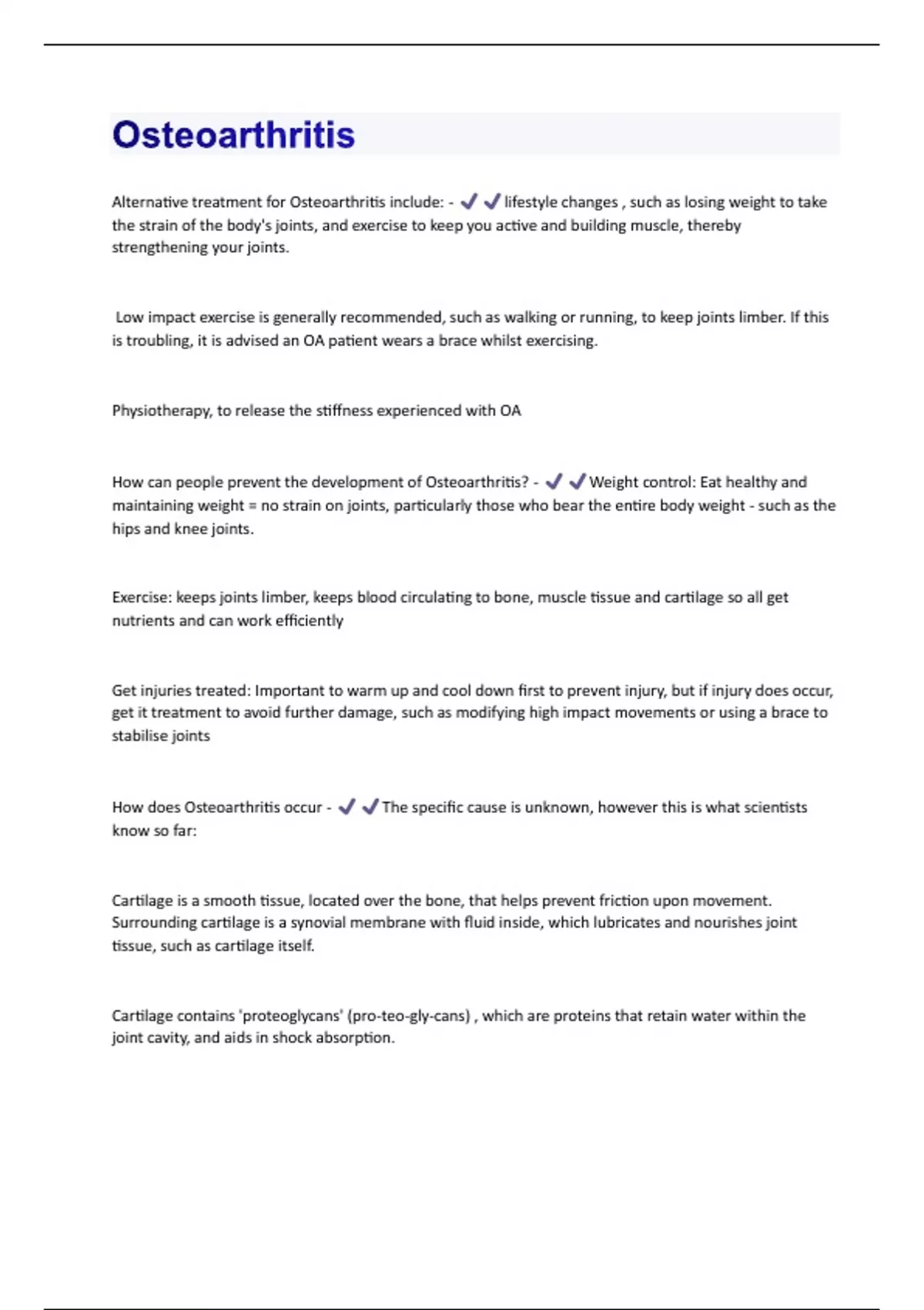Alternative treatment for Osteoarthritis include: - lifestyle changes , such as losing weight to take the strain of the body's joints, and exercise to keep you active and building muscle, thereby strengthening your joints. Low impact exercise is generally recommended, such as walking or running, to keep joints limber. If this is troubling, it is advised an OA patient wears a brace whilst exercising. Physiotherapy, to release the stiffness experienced with OA How can people prevent the development of Osteoarthritis? - Weight control: Eat healthy and maintaining weight = no strain on joints, particularly those who bear the entire body weight - such as the hips and knee joints. Exercise: keeps joints limber, keeps blood circulating to bone, muscle tissue and cartilage so all get nutrients and can work efficiently Get injuries treated: Important to warm up and cool down first to prevent injury, but if injury does occur, get it treatment to avoid further damage, such as modifying high impact movements or using a brace to stabilise joints How does Osteoarthritis occur - The specific cause is unknown, however this is what scientists know so far: Cartilage is a smooth tissue, located over the bone, that helps prevent friction upon movement. Surrounding cartilage is a synovial membrane with fluid inside, which lubricates and nourishes joint tissue, such as cartilage itself. Cartilage contains 'proteoglycans' (pro-teo-gly-cans) , which are proteins that retain water within the joint cavity, and aids in shock absorption.Losing proteoglycans means the cartilage becomes dry and can crack. Once cracked, the cartilage can wear away, and the bone underneath may develop bone spurs (Small, bony outgrowths along joint margin), which decrease the space within the joint cavity, restricting the movement of joints themselves. How doest Osteoarthritis occur on a more complex level? (IL-1 and MMP's) - one a more technical level, scientists have discovered that an unknown factor may cause the increased secretion of proinflammatory molecules, one of which is IL-1. In term, IL-1 increases the activity of Matrix Metalloproteinases (MMP's), the degradative enzymes responsible for breaking apart cartilage. A loss of proteoglycans and water results in the creaking and drying out of bones. How is Osteoarthritis diagnosed? - X-rays can effectively detect osteoarthritis. In a healthy joint, cartilage is invisible in an x-ray. Therefore, an image shows the illusion that there is an empty black space between the bones of a joint. As cartilage erodes, this black space between the bones decreases, and bone offcuts become visible, therefore indicating OA Is Osteoarthritis a skeletal or joint tissue disease? - Joint tissue