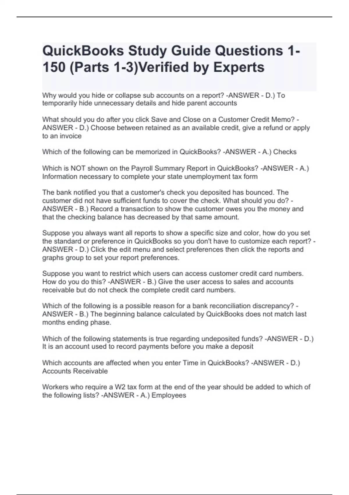 QuickBooks Study Guide Questions 1-150 (Parts 1-3)Verified by Experts