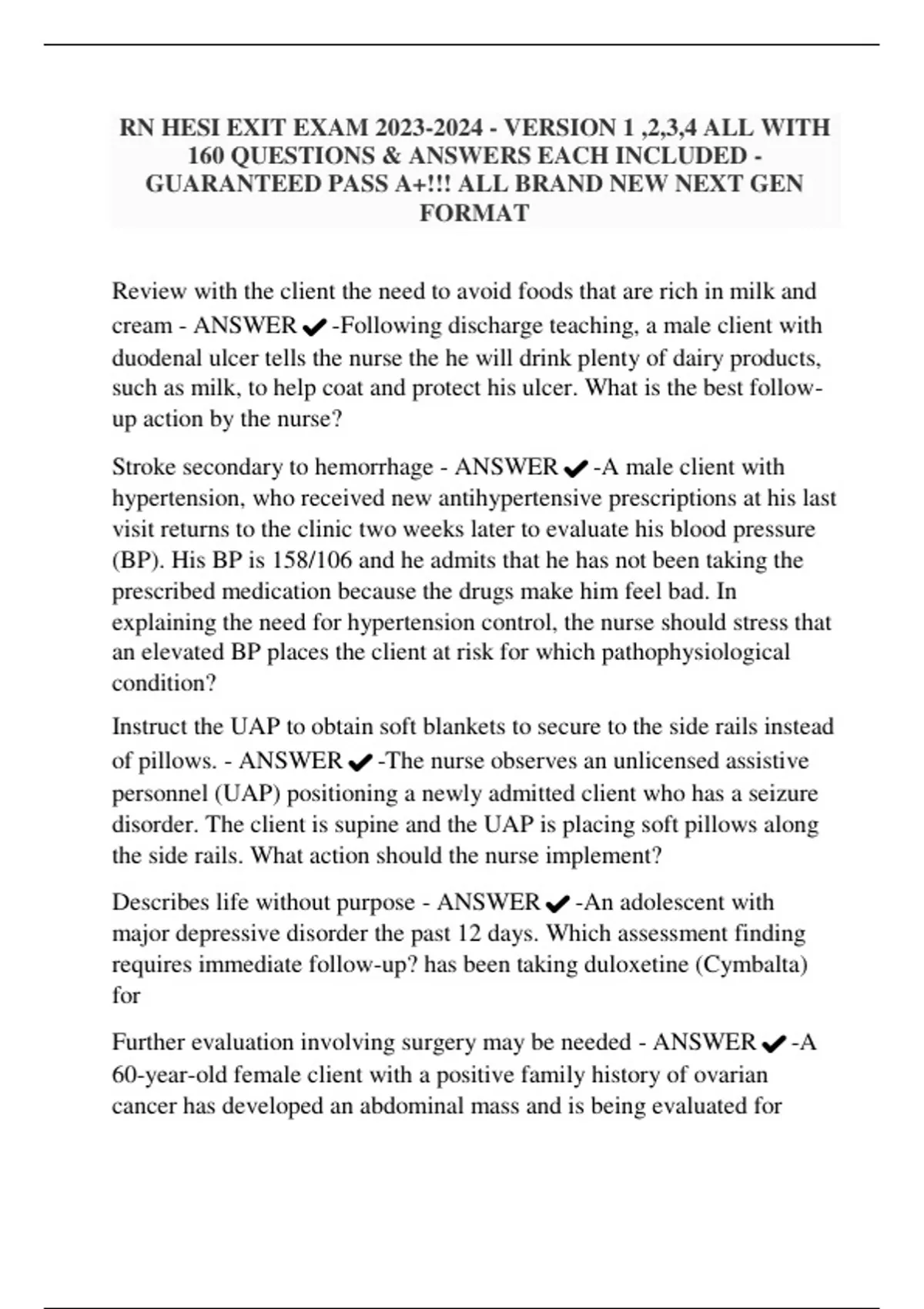 RN HESI EXIT EXAM - VERSION 1 ,2,3,4 ALL WITH 160 QUESTIONS & ANSWERS EACH INCLUDED - GUARANTEED PASS A+!!! ALL BRAND NEW NEXT GEN FORMAT