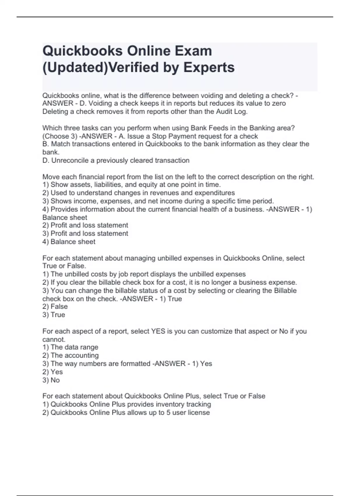 Quickbooks online, what is the difference between voiding and deleting a check? -ANSWER - D. Voiding a check keeps it in reports but reduces its value to zero Deleting a check removes it from reports other than the Audit Log. Which three tasks can you perform when using Bank Feeds in the Banking area? (Choose 3) -ANSWER - A. Issue a Stop Payment request for a check B. Match transactions entered in Quickbooks to the bank information as they clear the bank. D. Unreconcile a previously cleared transaction Move each financial report from the list on the left to the correct description on the right. 1) Show assets, liabilities, and equity at one point in time. 2) Used to understand changes in revenues and expenditures 3) Shows income, expenses, and net income during a specific time period. 4) Provides information about the current financial health of a business. -ANSWER - 1) Balance sheet 2) Profit and loss statement 3) Profit and loss statement 4) Balance sheet For each statement about managing unbilled expenses in Quickbooks Online, select True or False. 1) The unbilled costs by job report displays the unbilled expenses 2) If you clear the billable check box for a cost, it is no longer a business expense. 3) You can change the billable status of a cost by selecting or clearing the Billable check box on the check. -ANSWER - 1) True 2) False 3) True For each aspect of a report, select YES is you can customize that aspect or No if you cannot. 1) The data range 2) The accounting 3) The way numbers are formatted -ANSWER - 1) Yes 2) Yes 3) No For each statement about Quickbooks Online Plus, select True or False 1) Quickbooks Online Plus provides inventory tracking 2) Quickbooks Online Plus allows up to 5 user license 3) Quickbooks Online Plus provides project profitability tracking. 4) Quickbooks Online Plus includes Payroll support at no additional cost. -ANSWER - 1) True 2) True 3) True 4) False For each statement about the Cash Flow Statement, select True or False 1) if shows a business's assets, liabilities, and equity 2) It summarizes the cash flowing in and out of a business 3) It is divided intro three sections: Operations, Investments, and Financing 4) It is another name for an income st