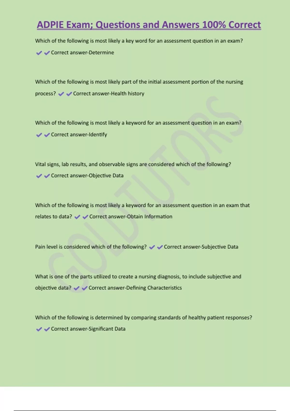 ADPIE Exam; Questions and Answers 100% Correct Which of the following is most likely a key word for an assessment question in an exam? Correct answer-Determine Which of the following is most likely part of the initial assessment portion of the nursing process? Correct answer-Health history Which of the following is most likely a keyword for an assessment question in an exam? Correct answer-Identify Vital signs, lab results, and observable signs are considered which of the following? Correct answer-Objective Data