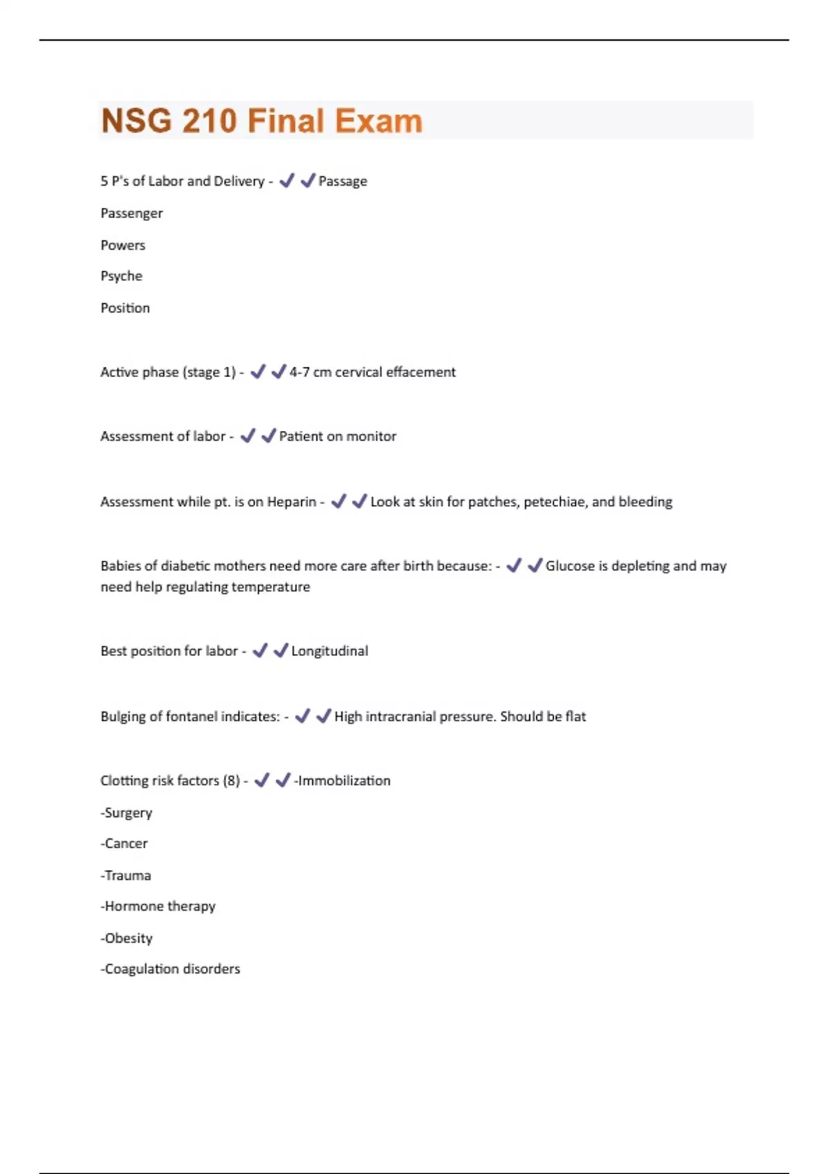 5 P's of Labor and Delivery - Passage Passenger Powers Psyche Position Active phase (stage 1) - 4-7 cm cervical effacement Assessment of labor - Patient on monitor Assessment while pt. is on Heparin - Look at skin for patches, petechiae, and bleeding Babies of diabetic mothers need more care after birth because: - Glucose is depleting and may need help regulating temperature Best position for labor - Longitudinal Bulging of fontanel indicates: - High intracranial pressure. Should be flat Clotting risk factors (8) - -Immobilization -Surgery -Cancer -Trauma -Hormone therapy -Obesity -Coagulation disorders-Personal/family Hx Clotting tx - -Pharmacologic interventions -Surgery -Relieve so's, reduce inflammation Complications of vaginal examination (3) - -Fetal distress (cord around neck/compression) -Types of decels -Cord prolapse Consequence of baby's head being too large to pass through mid pelvis - Mother cannot be induced Contraindications for epidural - -Anti coagulants -Low platelets Define thrombophlebitis - Formation of blood cloth and blocks veins typically in the legs Desirable fetal assessment amplitude - 5 - 25 bmp DIC definition - Condition affecting blood's ability to clot and stop bleeding. Blood clots from throughout the body DIC implementation (7) - -Cool compress to painful joints -Monitor Spo2 (Fowler, deep breathing, coughing) -Bedrest -Assess effective perfusion -Monitor mental status -Discourage leg crossing and DO NOT elevate legs with pillows-Minimize tape on skin