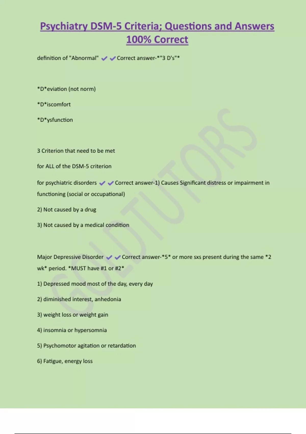 Psychiatry DSM-5 Criteria; Questions and Answers 100% Correct definition of "Abnormal" Correct answer-*"3 D's"* *D*eviation (not norm) *D*iscomfort *D*ysfunction 3 Criterion that need to be met for ALL of the DSM-5 criterion for psychiatric disorders Correct answer-1) Causes Significant distress or impairment in functioning (social or occupational) 2) Not caused by a drug 3) Not caused by a medical condition