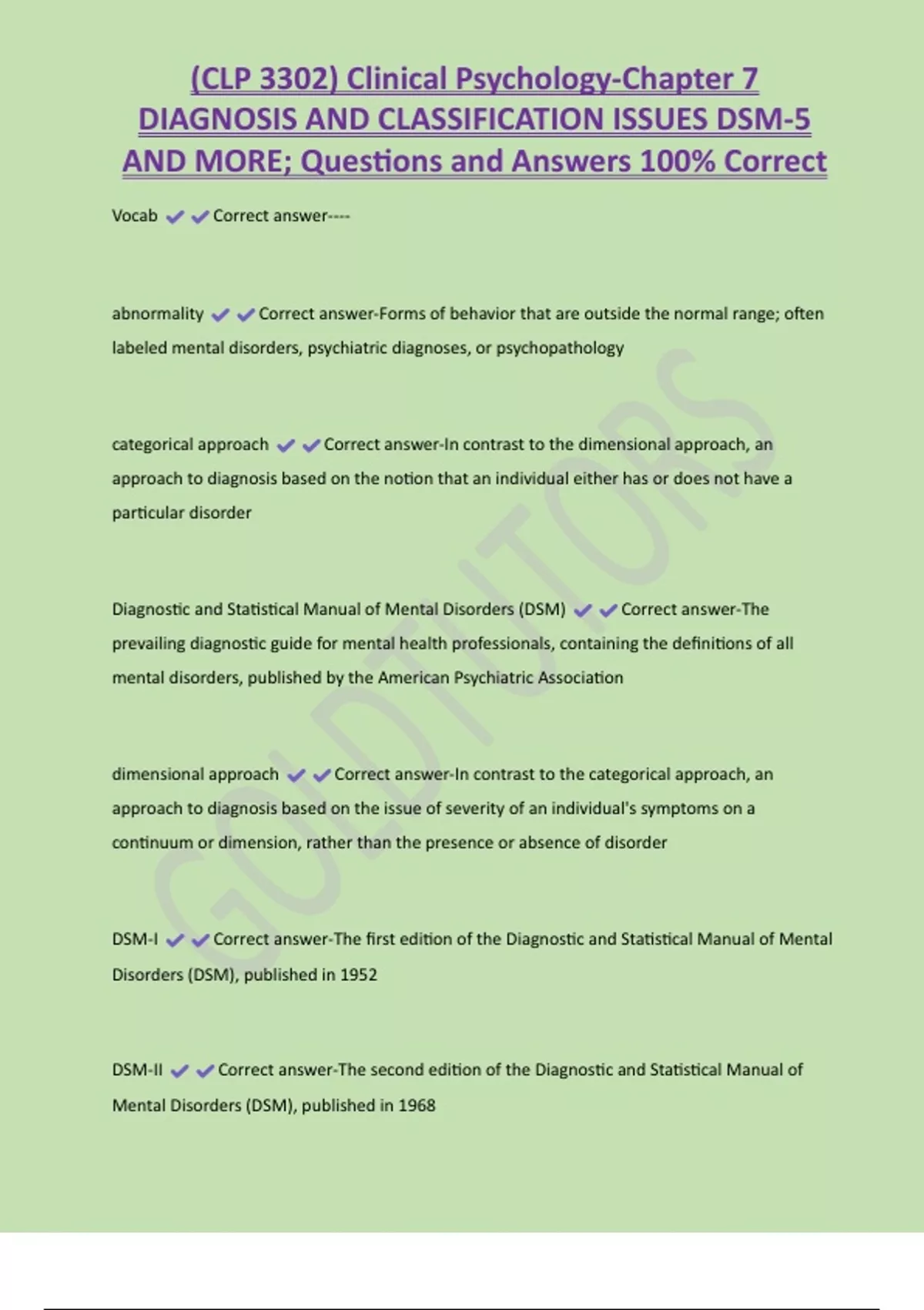 (CLP 3302) Clinical Psychology-Chapter 7 DIAGNOSIS AND CLASSIFICATION ISSUES DSM-5 AND MORE; Questions and Answers 100% Correct Vocab Correct answer---- abnormality Correct answer-Forms of behavior that are outside the normal range; often labeled mental disorders, psychiatric diagnoses, or psychopathology categorical approach Correct answer-In contrast to the dimensional approach, an approach to diagnosis based on the notion that an individual either has or does not have a particular disorde