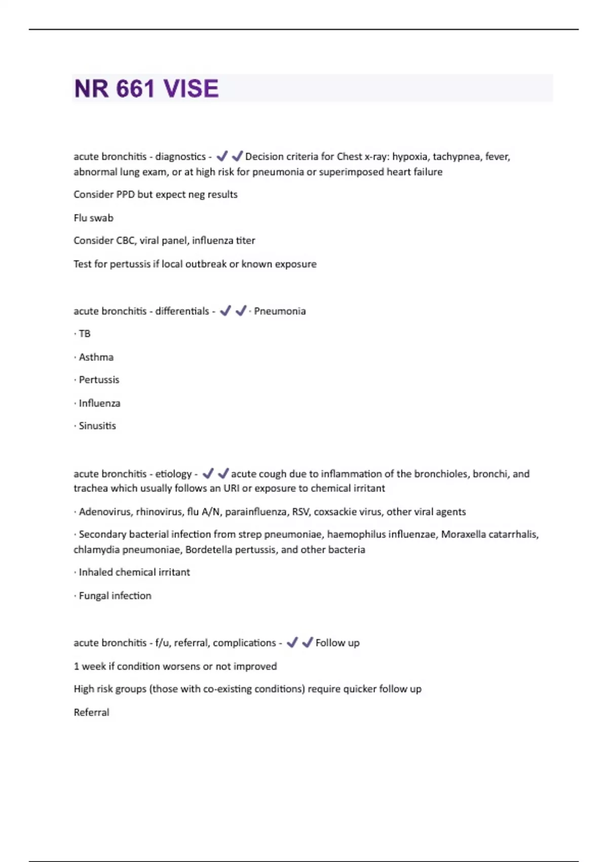 acute bronchitis - diagnostics - Decision criteria for Chest x-ray: hypoxia, tachypnea, fever, abnormal lung exam, or at high risk for pneumonia or superimposed heart failure Consider PPD but expect neg results Flu swab Consider CBC, viral panel, influenza titer Test for pertussis if local outbreak or known exposure acute bronchitis - differentials - · Pneumonia · TB · Asthma · Pertussis · Influenza · Sinusitis acute bronchitis - etiology - acute cough due to inflammation of the bronchioles, bronchi, and trachea which usually follows an URI or exposure to chemical irritant · Adenovirus, rhinovirus, flu A/N, parainfluenza, RSV, coxsackie virus, other viral agents · Secondary bacterial infection from strep pneumoniae, haemophilus influenzae, Moraxella catarrhalis, chlamydia pneumoniae, Bordetella pertussis, and other bacteria · Inhaled chemical irritant · Fungal infection acute bronchitis - f/u, referral, complications - Follow up 1 week if condition worsens or not improved High risk groups (those with co-existing conditions) require quicker follow up ReferralNone now pulmonologist if not improved in 4 weeks. Complications: · chronic cough · secondary infection acute bronchitis - nonpharmacological - increase fluid intake, use humidifier, rest, Smoking cessation acute bronchitis - pharmacological - Antibiotics not recommended Cough suppressants - nighttime Antivirals if flu is diagnosed IF bacterial, Z-Pack 500mg day one and 250 mg for 4 days (positive Pneumonia) Tessalon pearls 200mg TID PRN Albuterol inhaler 2 inhalations every 4-6 hours as needed, if wheezing or prior history of asthma Decongestants and antihistamines are not effective