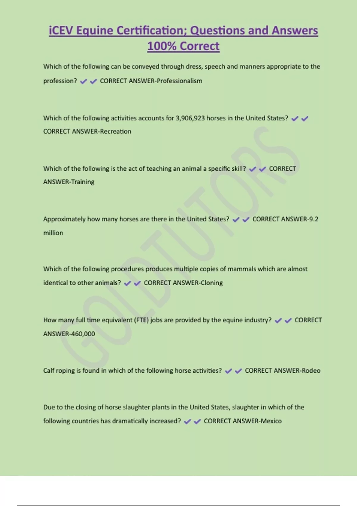 iCEV Equine Certification; Questions and Answers 100% Correct Which of the following can be conveyed through dress, speech and manners appropriate to the profession? CORRECT ANSWER-Professionalism Which of the following activities accounts for 3,906,923 horses in the United States? CORRECT ANSWER-Recreation Which of the following is the act of teaching an animal a specific skill? CORRECT ANSWER-Traini