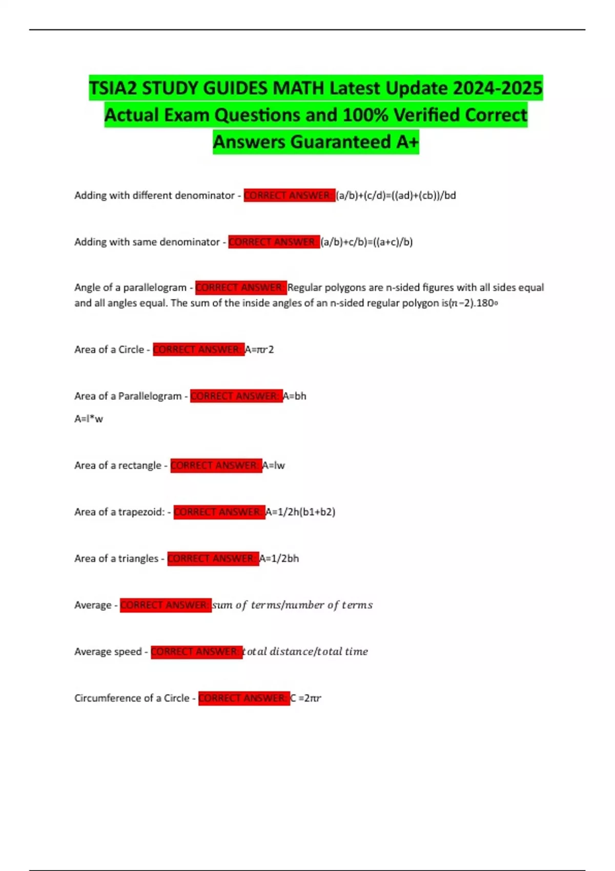 TSIA2 STUDY GUIDES MATH Latest Update Actual Exam Questions and 100% Verified Correct Answers Guaranteed A+